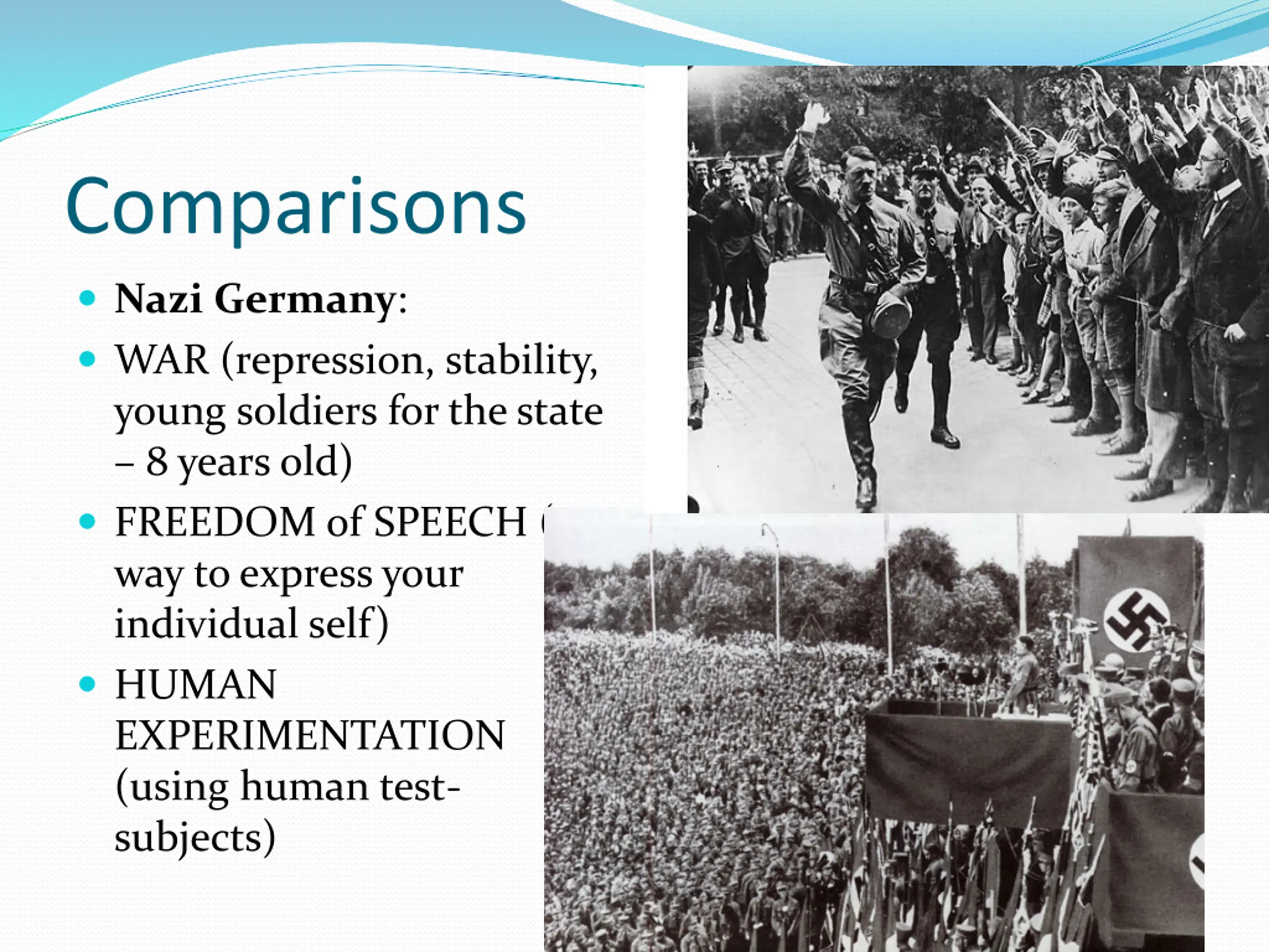 Comparisons Nazi Germany: WAR (repression, stability, young soldiers for the state 8 years old) FREEDOM of SPEECH (no way to express your individual self) HUMAN EXPERIMENTATION (using human test- subjects)