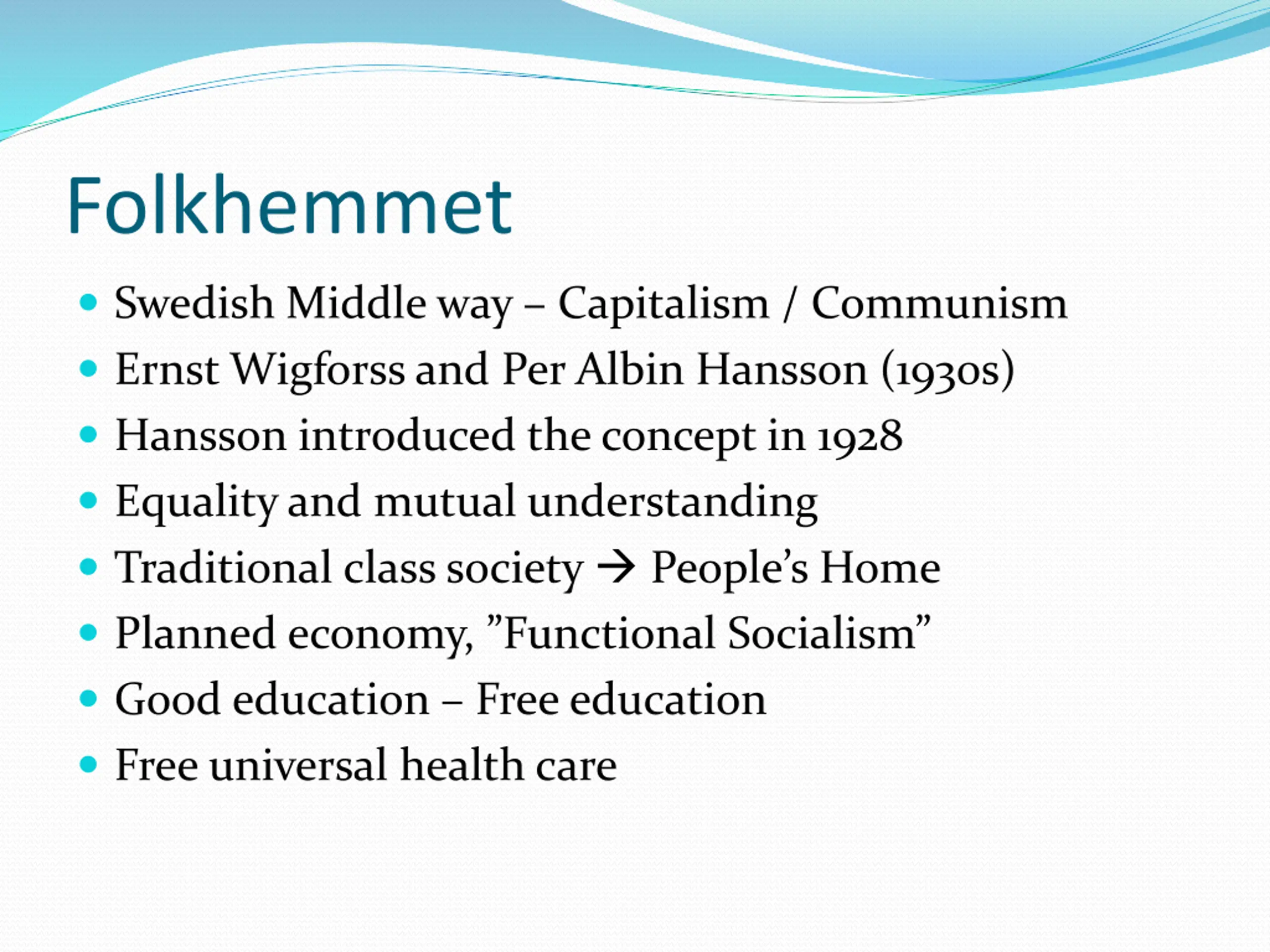 Folkhemmet Swedish Middle way Capitalism / Communism Ernst Wigforss and Per Albin Hansson (1930s) Hansson introduced the concept in 1928 Equality and mutual understanding Traditional class society People s Home Planned economy, Functional Socialism Good education Free education Free universal health care