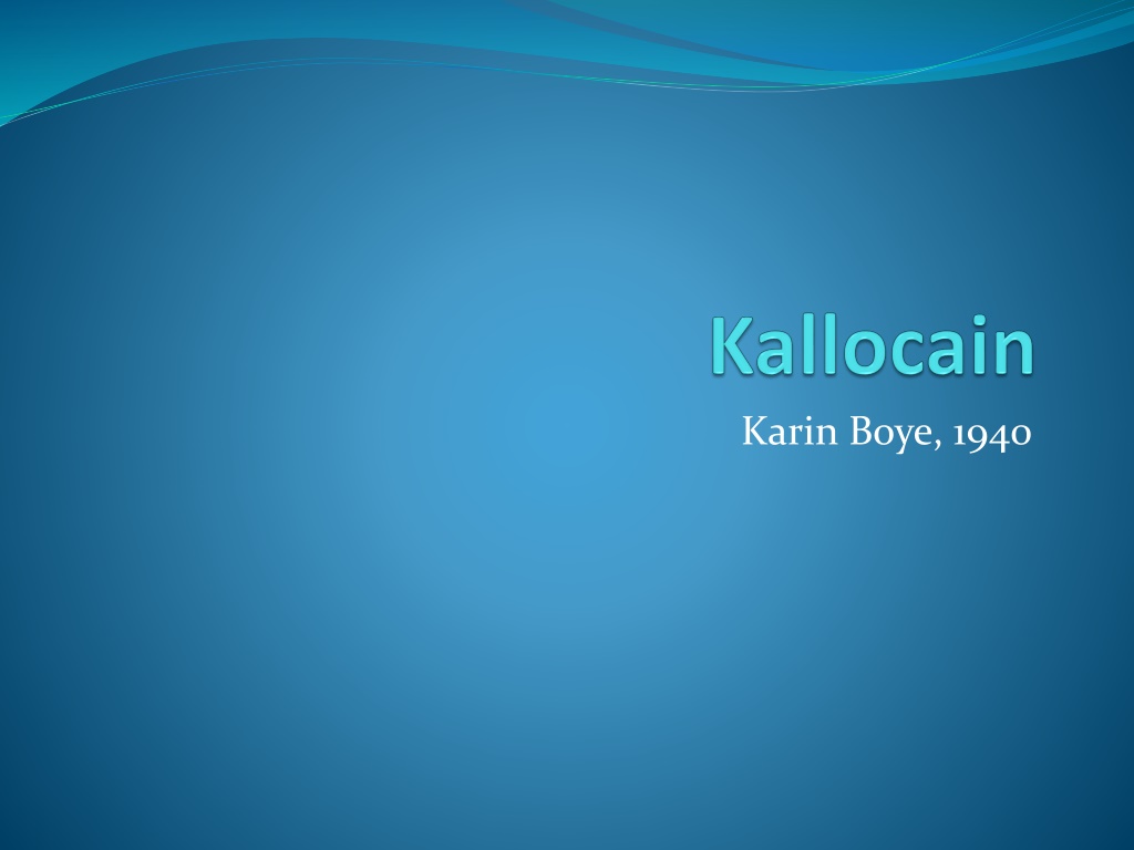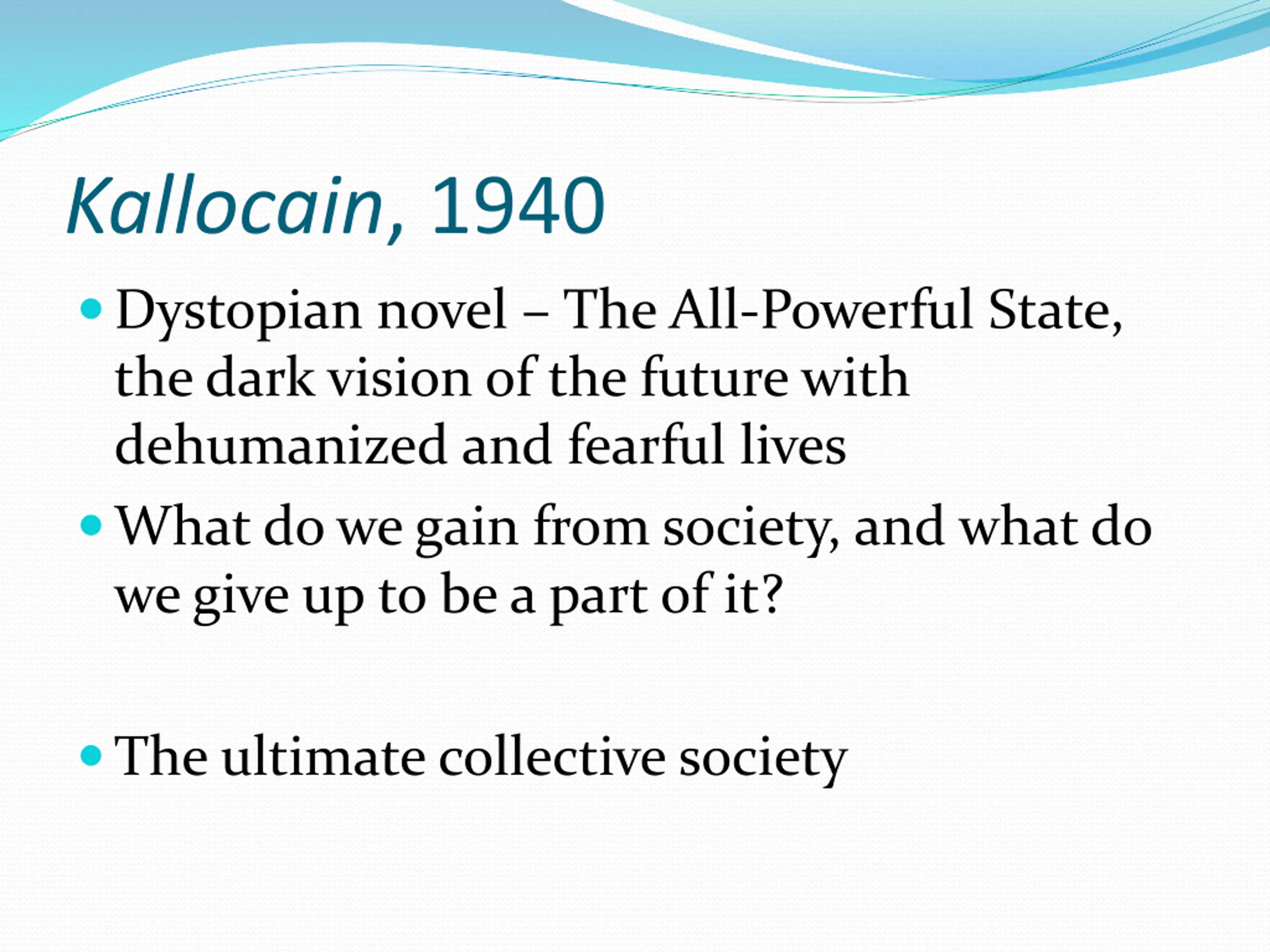 Kallocain, 1940 Dystopian novel The All-Powerful State, the dark vision of the future with dehumanized and fearful lives What do we gain from society, and what do we give up to be a part of it? The ultimate collective society