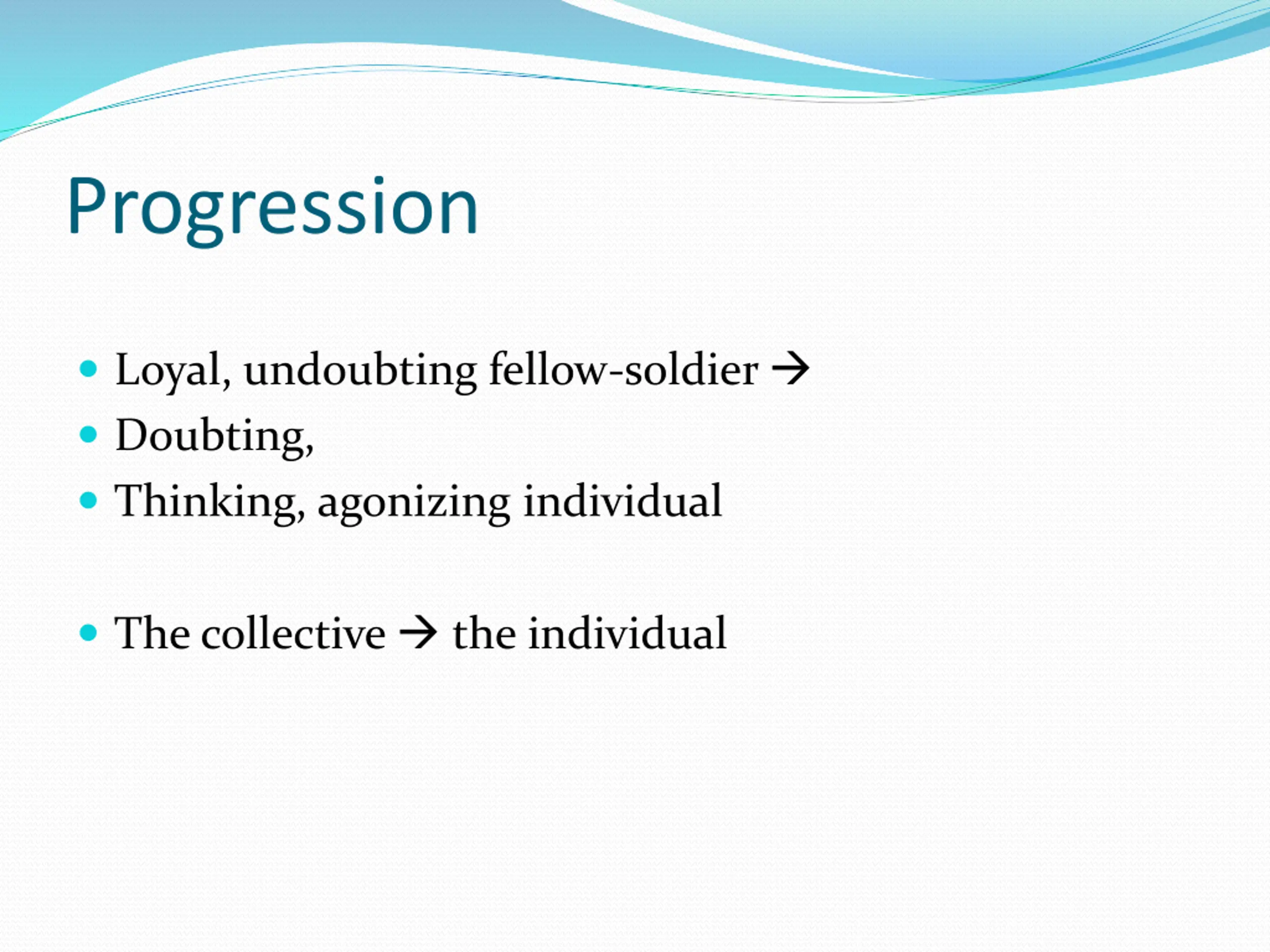 Progression Loyal, undoubting fellow-soldier Doubting, Thinking, agonizing individual The collective the individual