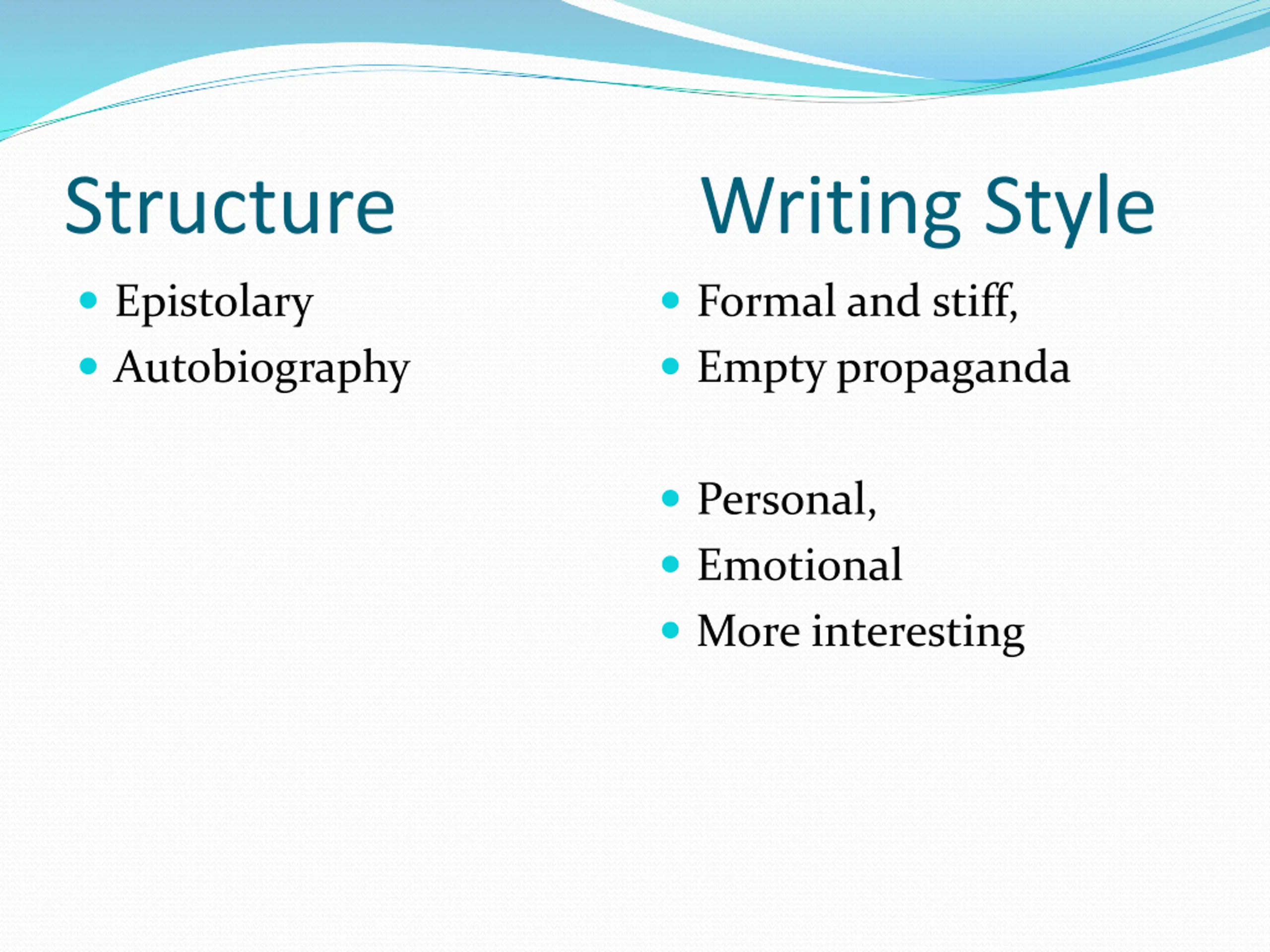 Structure Writing Style Epistolary Autobiography Formal and stiff, Empty propaganda Personal, Emotional More interesting