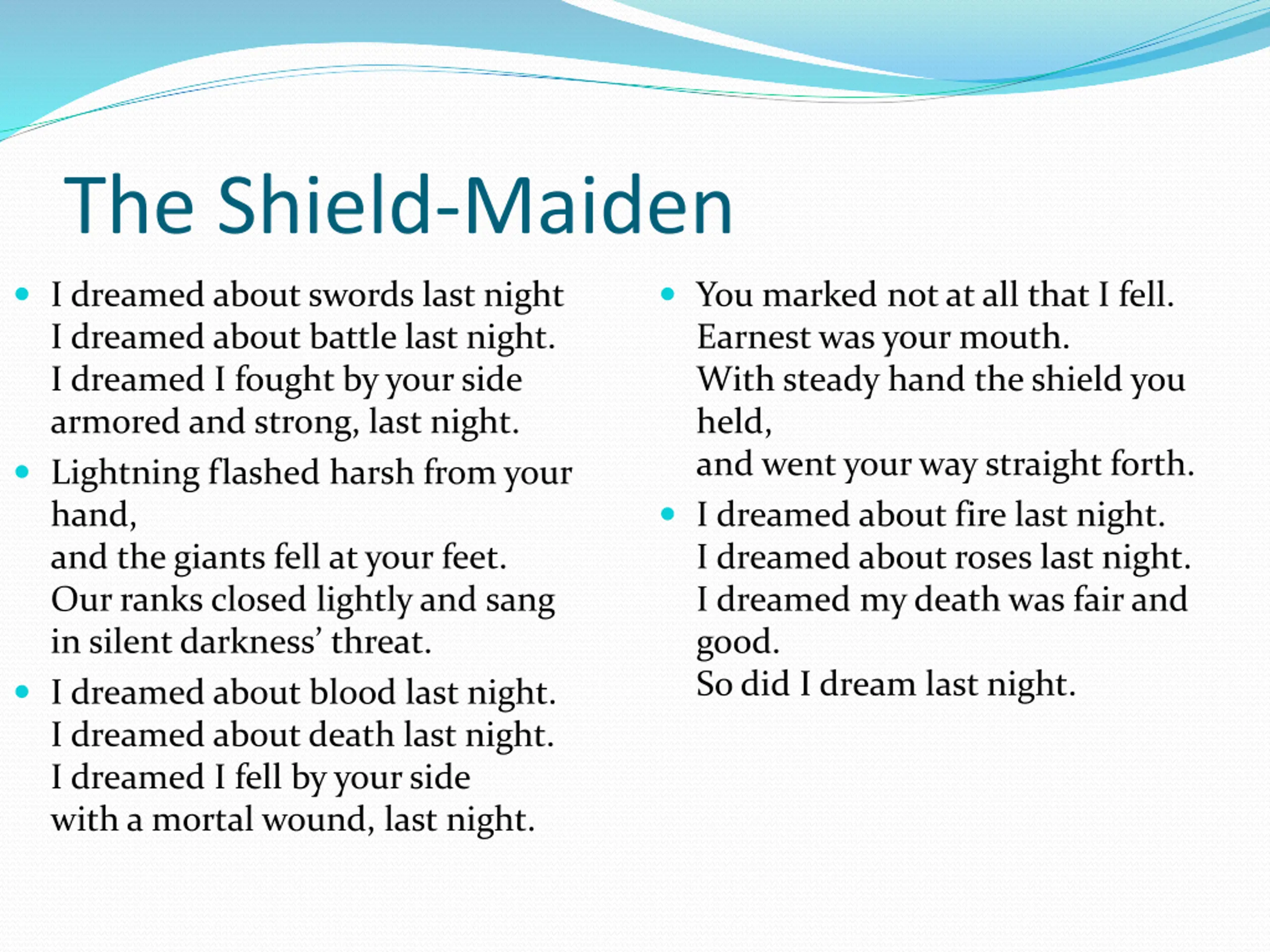 The Shield-Maiden I dreamed about swords last night I dreamed about battle last night. I dreamed I fought by your side armored and strong, last night. Lightning flashed harsh from your hand, and the giants fell at your feet. Our ranks closed lightly and sang in silent darkness threat. I dreamed about blood last night. I dreamed about death last night. I dreamed I fell by your side with a mortal wound, last night. You marked not at all that I fell. Earnest was your mouth. With steady hand the shield you held, and went your way straight forth. I dreamed about fire last night. I dreamed about roses last night. I dreamed my death was fair and good. So did I dream last night.