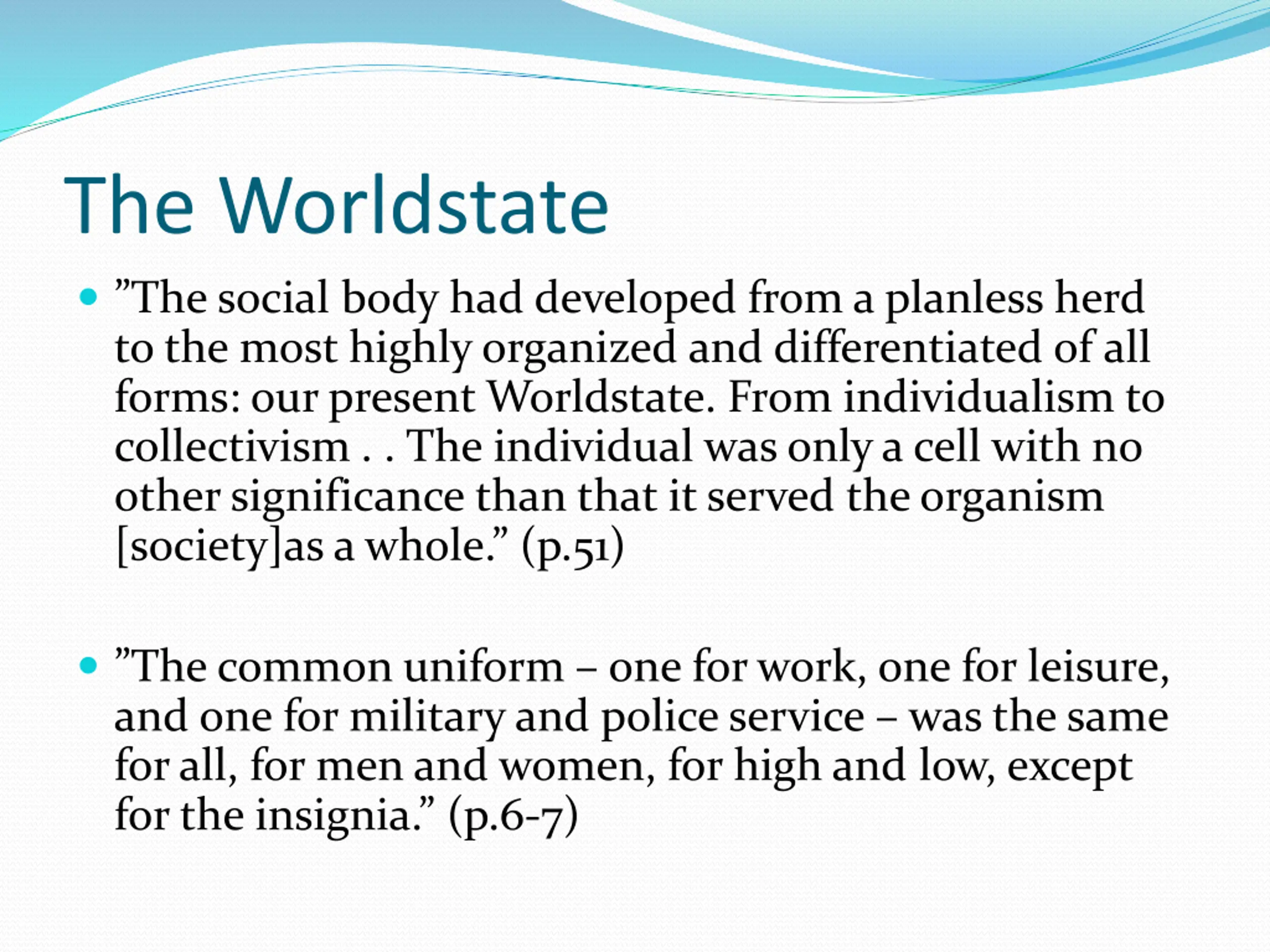 The Worldstate The social body had developed from a planless herd to the most highly organized and differentiated of all forms: our present Worldstate. From individualism to collectivism . . The individual was only a cell with no other significance than that it served the organism [society]as a whole. (p.51) The common uniform one for work, one for leisure, and one for military and police service was the same for all, for men and women, for high and low, except for the insignia. (p.6-7)