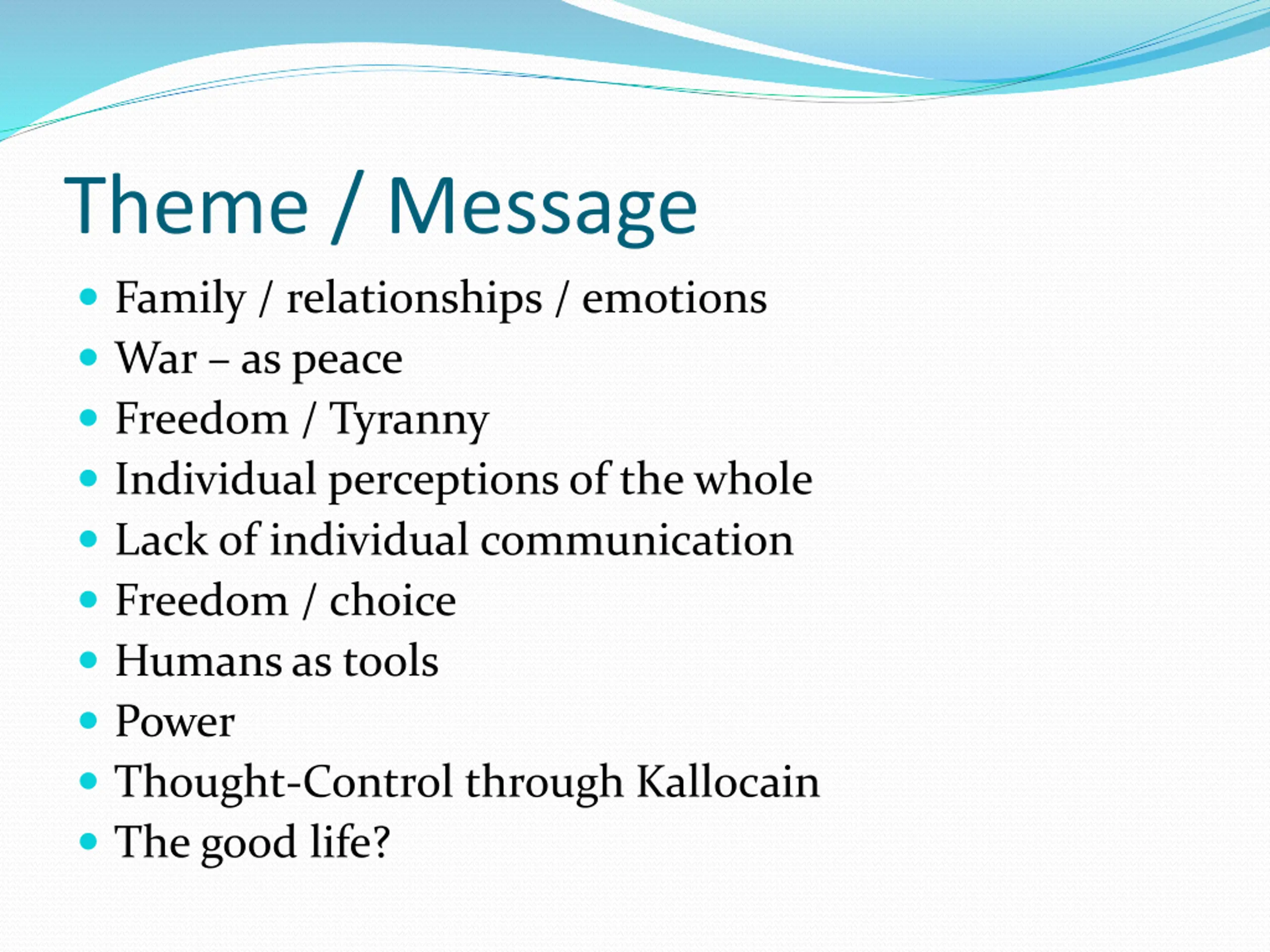 Theme / Message Family / relationships / emotions War as peace Freedom / Tyranny Individual perceptions of the whole Lack of individual communication Freedom / choice Humans as tools Power Thought-Control through Kallocain The good life?