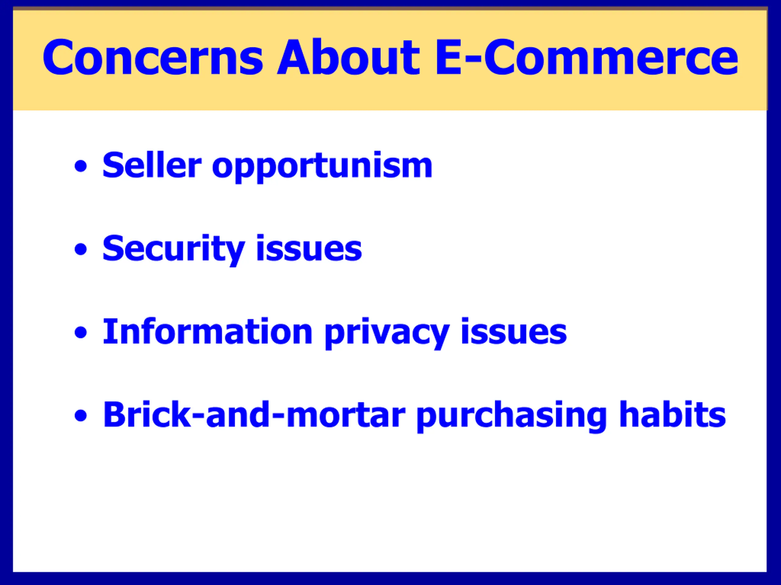 Concerns About E-Commerce Seller opportunism Security issues Information privacy issues Brick-and-mortar purchasing habits