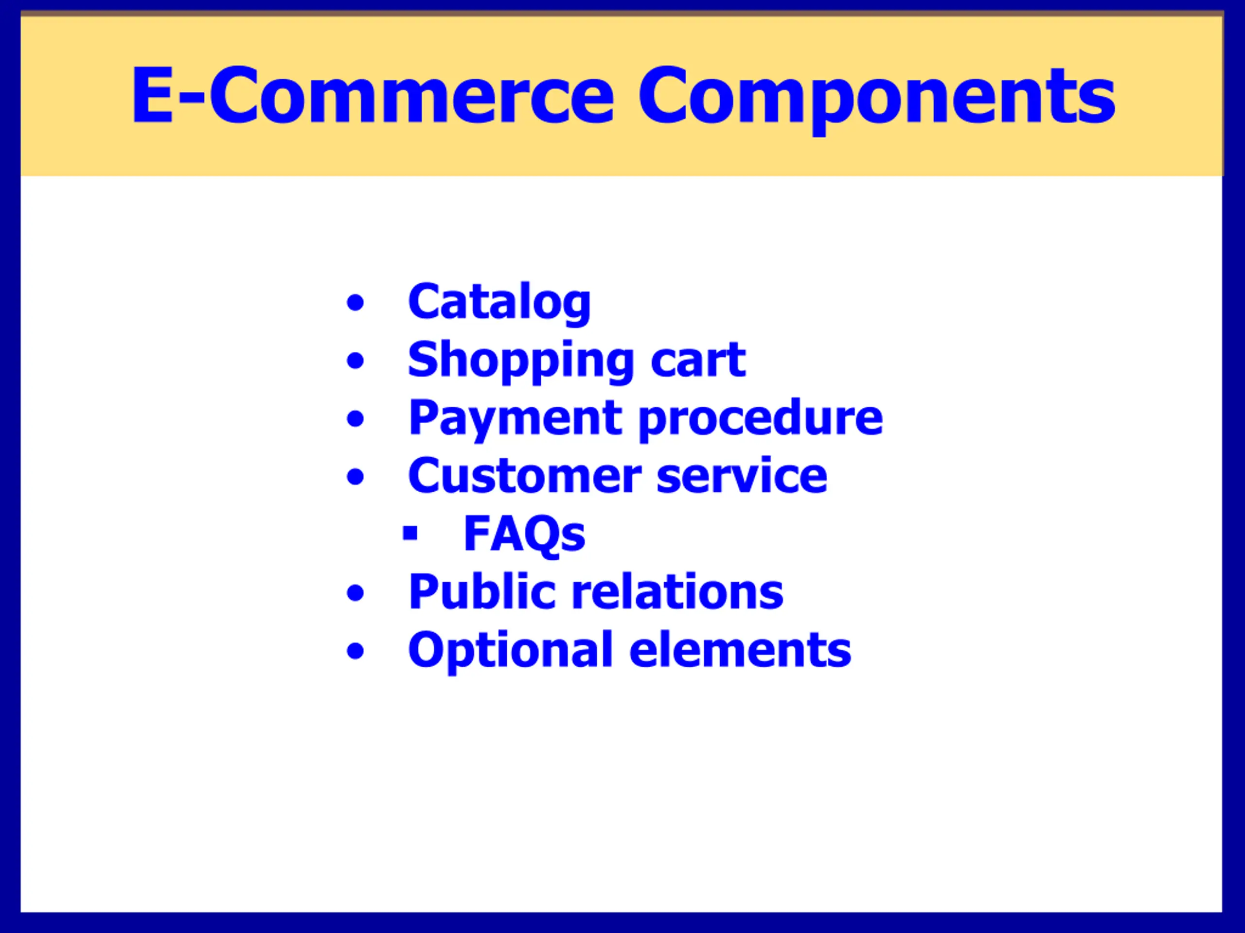 E-Commerce Components Catalog Shopping cart Payment procedure Customer service FAQs Public relations Optional elements
