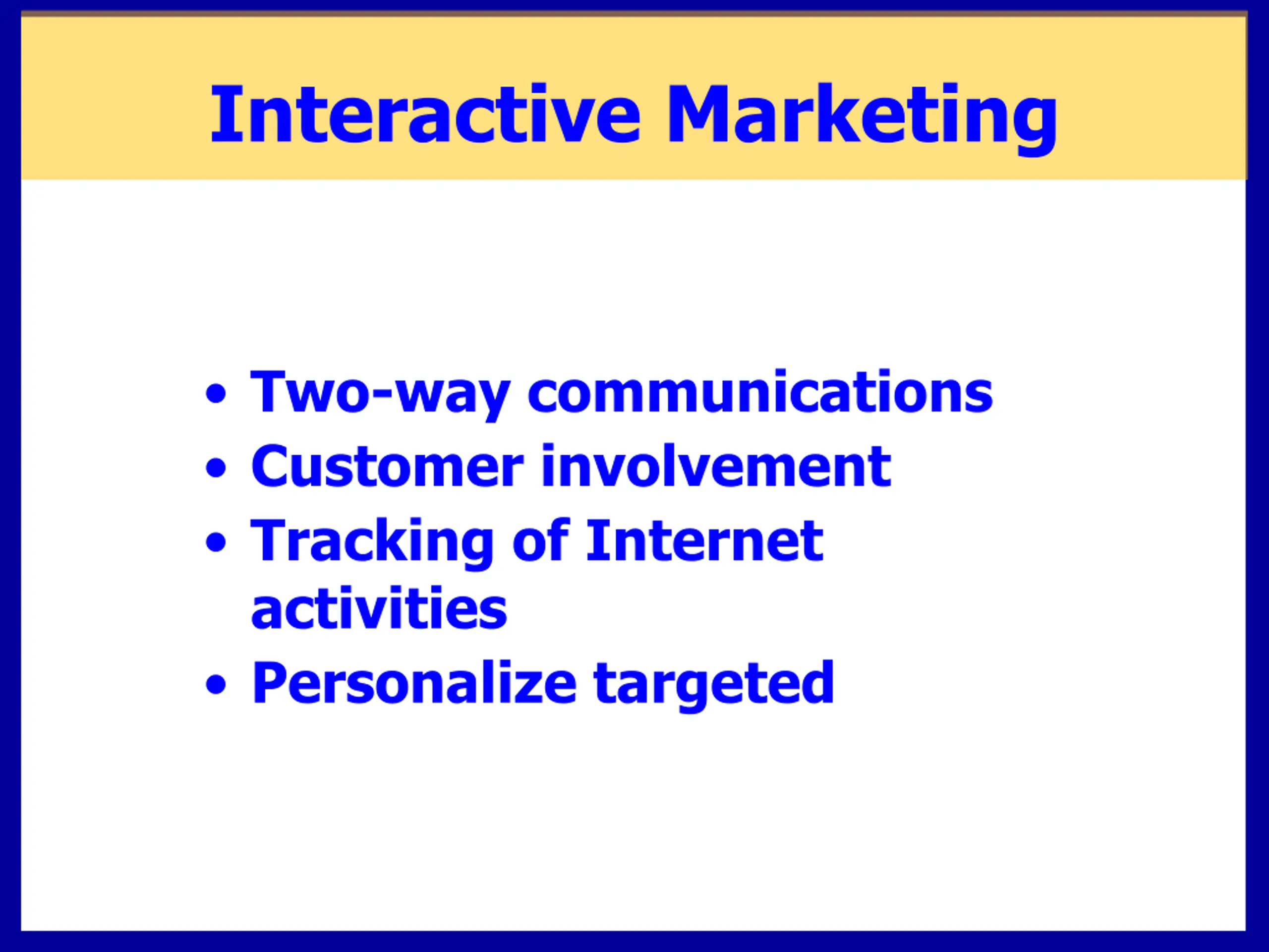Interactive Marketing Two-way communications Customer involvement Tracking of Internet activities Personalize targeted