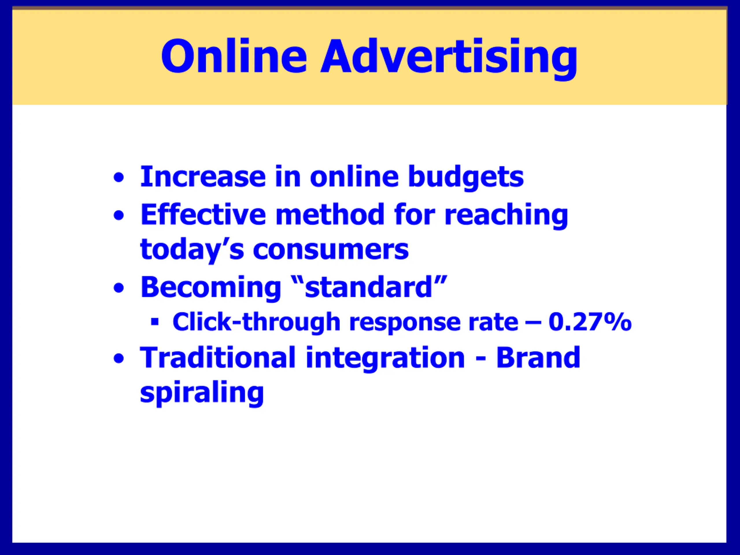 Online Advertising Increase in online budgets Effective method for reaching today s consumers Becoming standard Click-through response rate 0.27% Traditional integration - Brand spiraling