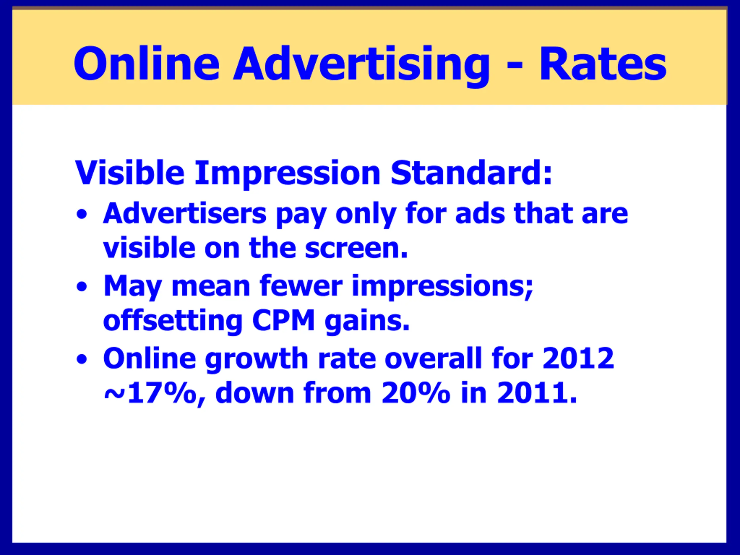 Online Advertising - Rates Visible Impression Standard: Advertisers pay only for ads that are visible on the screen. May mean fewer impressions; offsetting CPM gains. Online growth rate overall for 2012 ~17%, down from 20% in 2011.