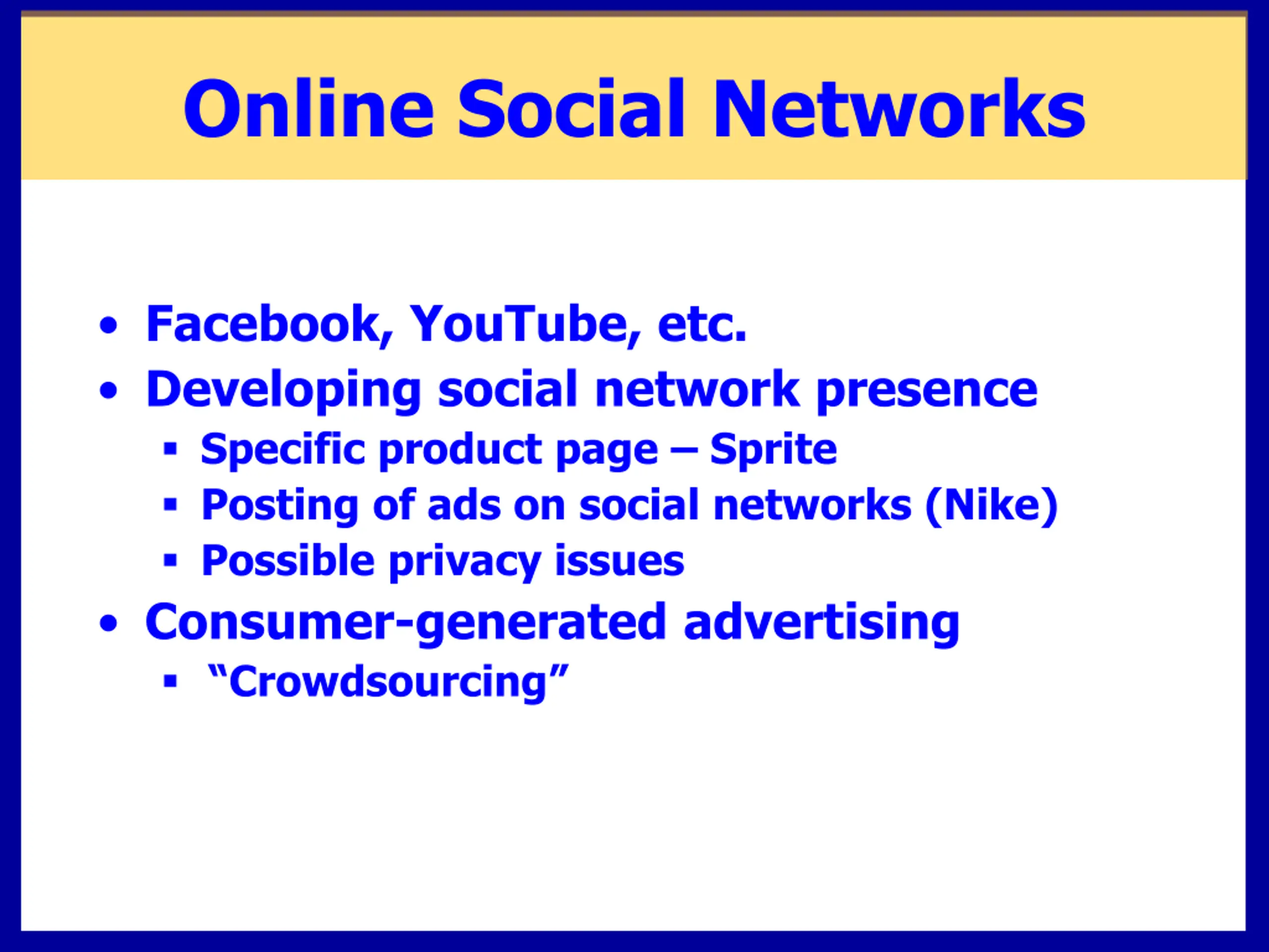 Online Social Networks Facebook, YouTube, etc. Developing social network presence Specific product page Sprite Posting of ads on social networks (Nike) Possible privacy issues Consumer-generated advertising Crowdsourcing
