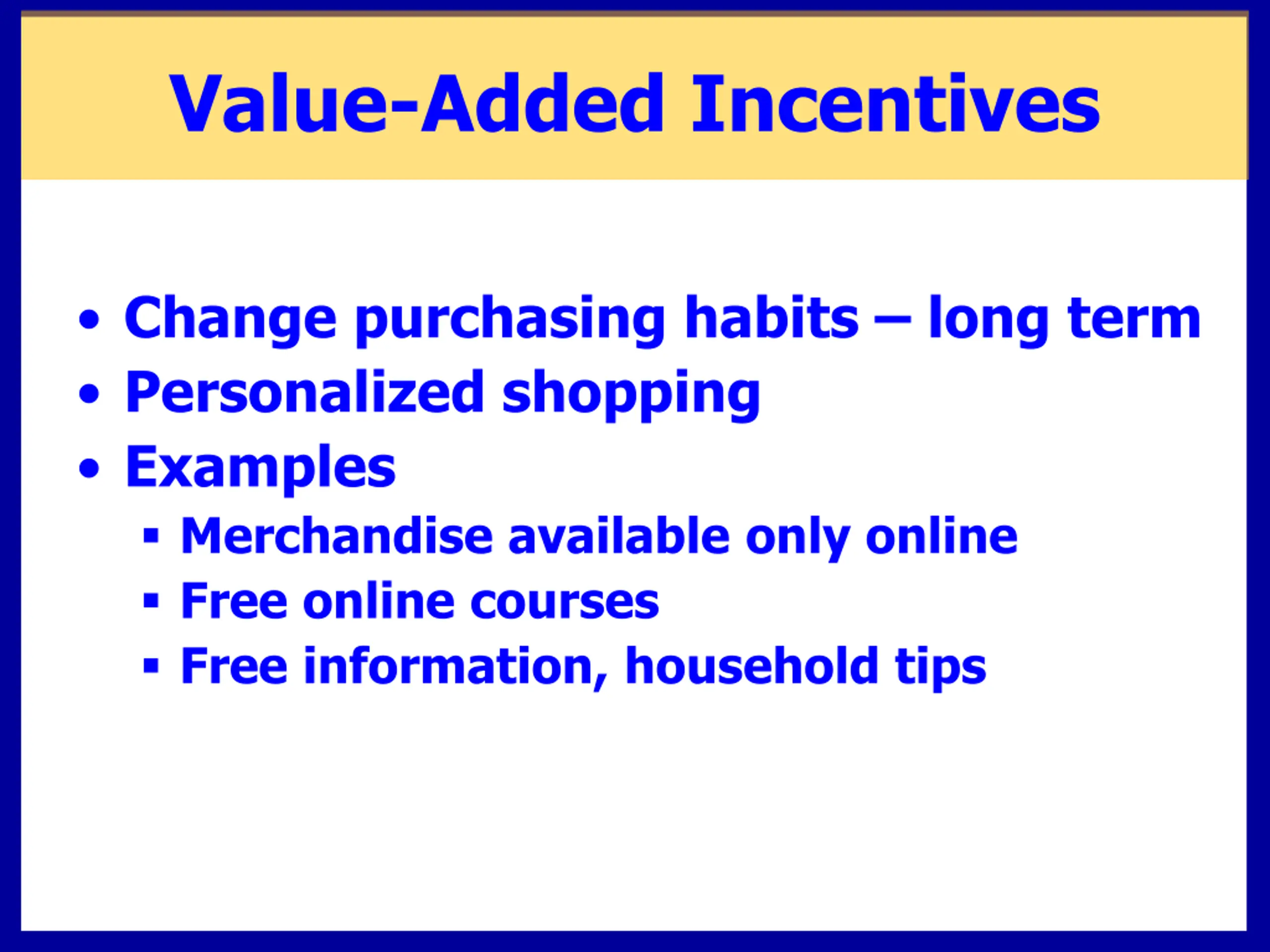 Value-Added Incentives Change purchasing habits long term Personalized shopping Examples Merchandise available only online Free online courses Free information, household tips
