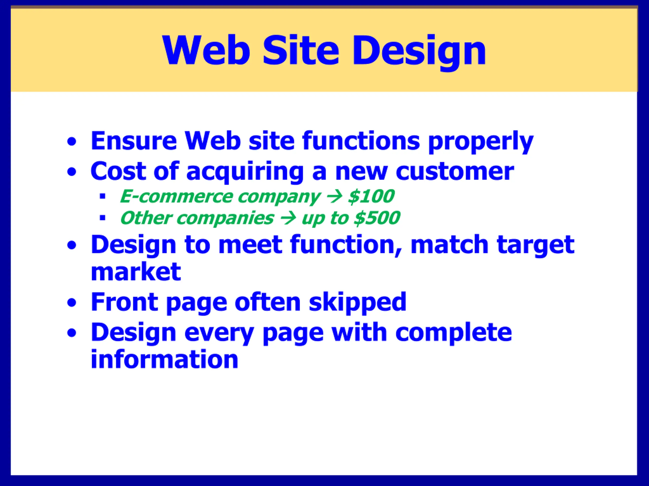 Web Site Design Ensure Web site functions properly Cost of acquiring a new customer E-commerce company Other companies up to $500 Design to meet function, match target market Front page often skipped Design every page with complete information $100