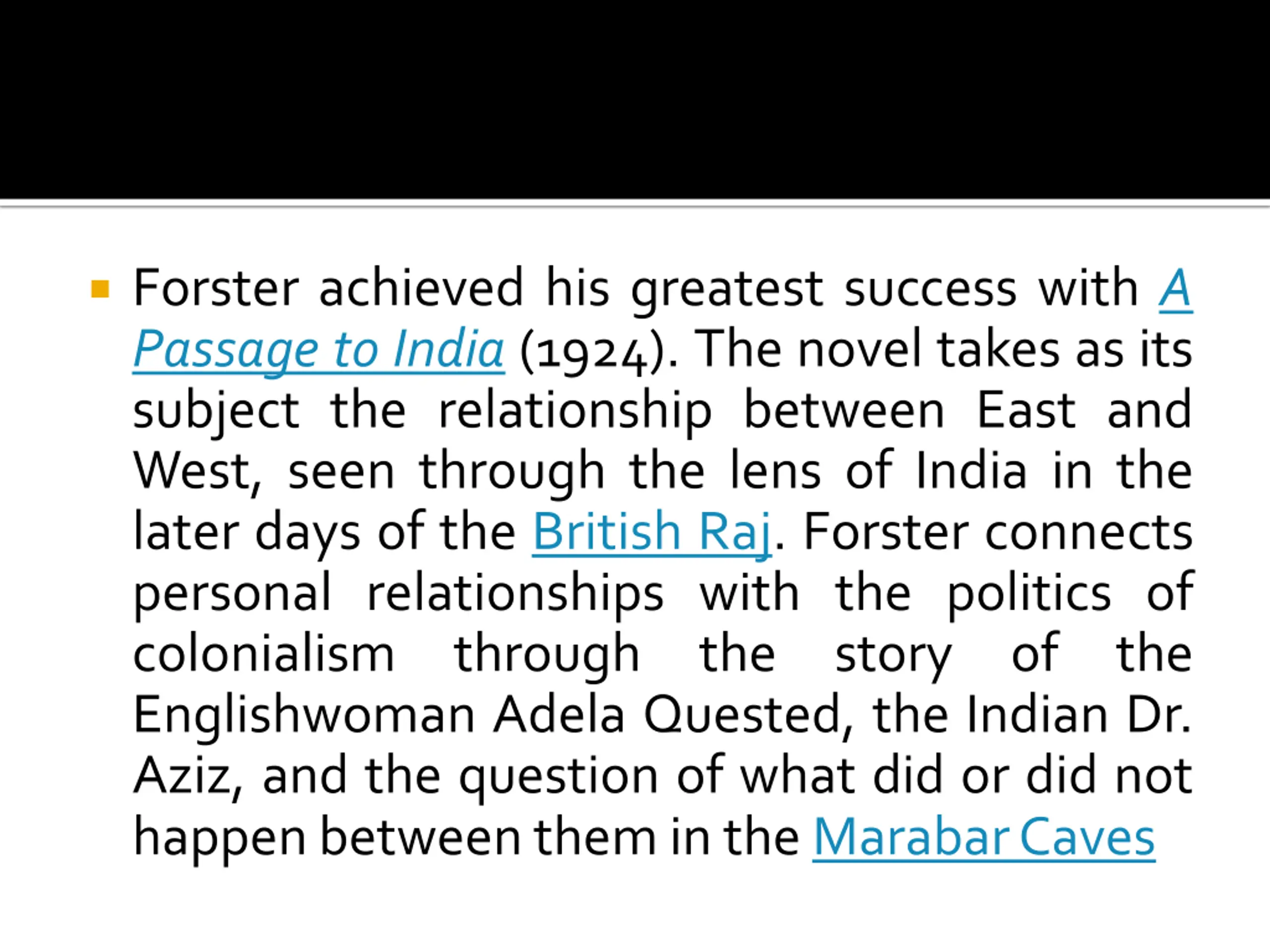 Forster achieved his greatest success with A Passage to India (1924). The novel takes as its subject the relationship between East and West, seen through the lens of India in the later days of the British Raj. Forster connects personal relationships with the politics of colonialism through Englishwoman Adela Quested, the Indian Dr. Aziz, and the question of what did or did not happenbetweenthemintheMarabarCaves the story of the