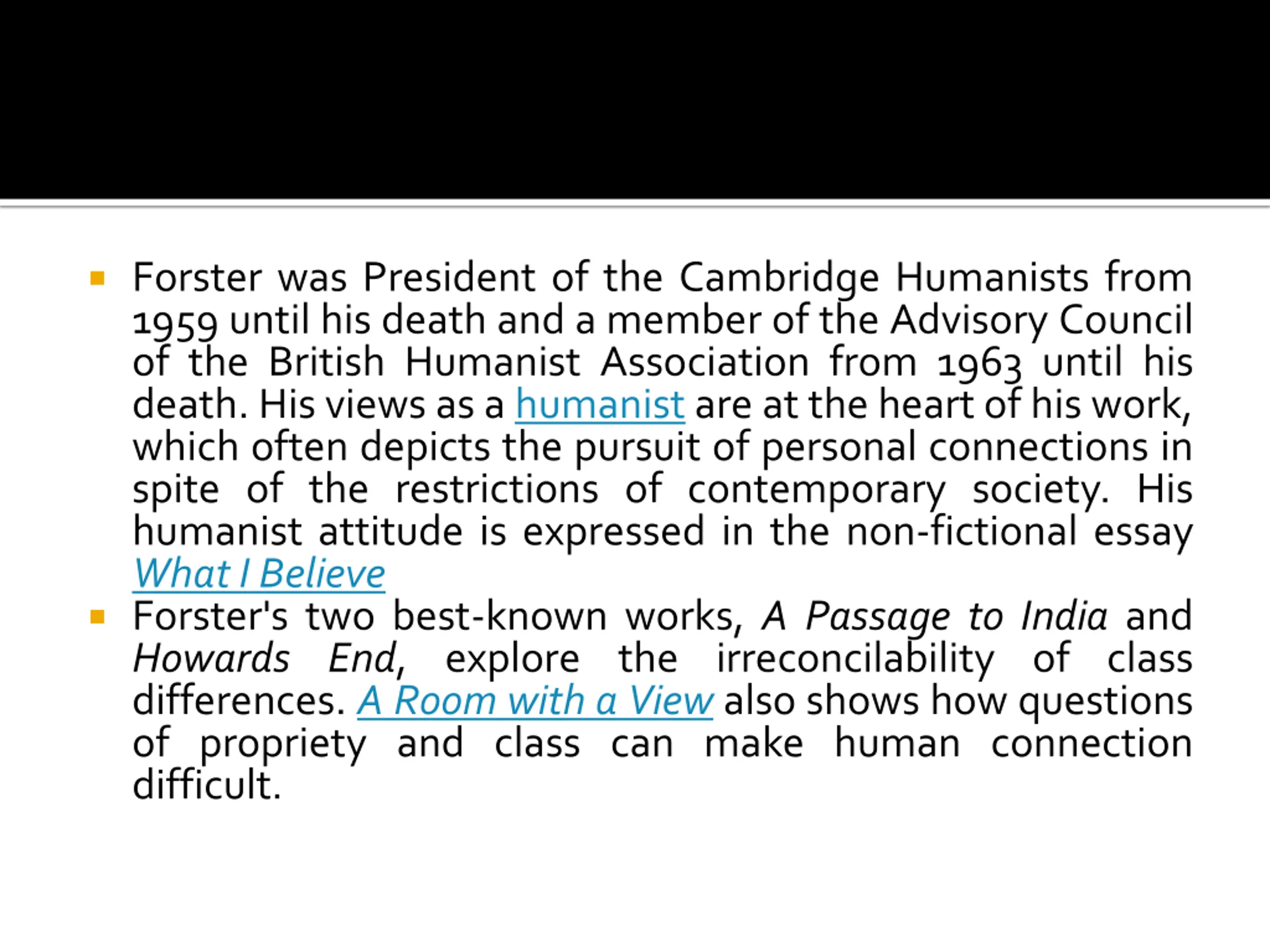 Forster was President of the Cambridge Humanists from 1959 until his death and a member of the Advisory Council of the British Humanist Association from 1963 until his death. His views as a humanist are at the heart of his work, which often depicts the pursuit of personal connections in spite of the restrictions of contemporary society. His humanist attitude is expressed in the non-fictional essay WhatI Believe Forster's two best-known works, A Passage to India and Howards End, explore the irreconcilability of class differences. A Room with a View also shows how questions of propriety and class can make human connection difficult.