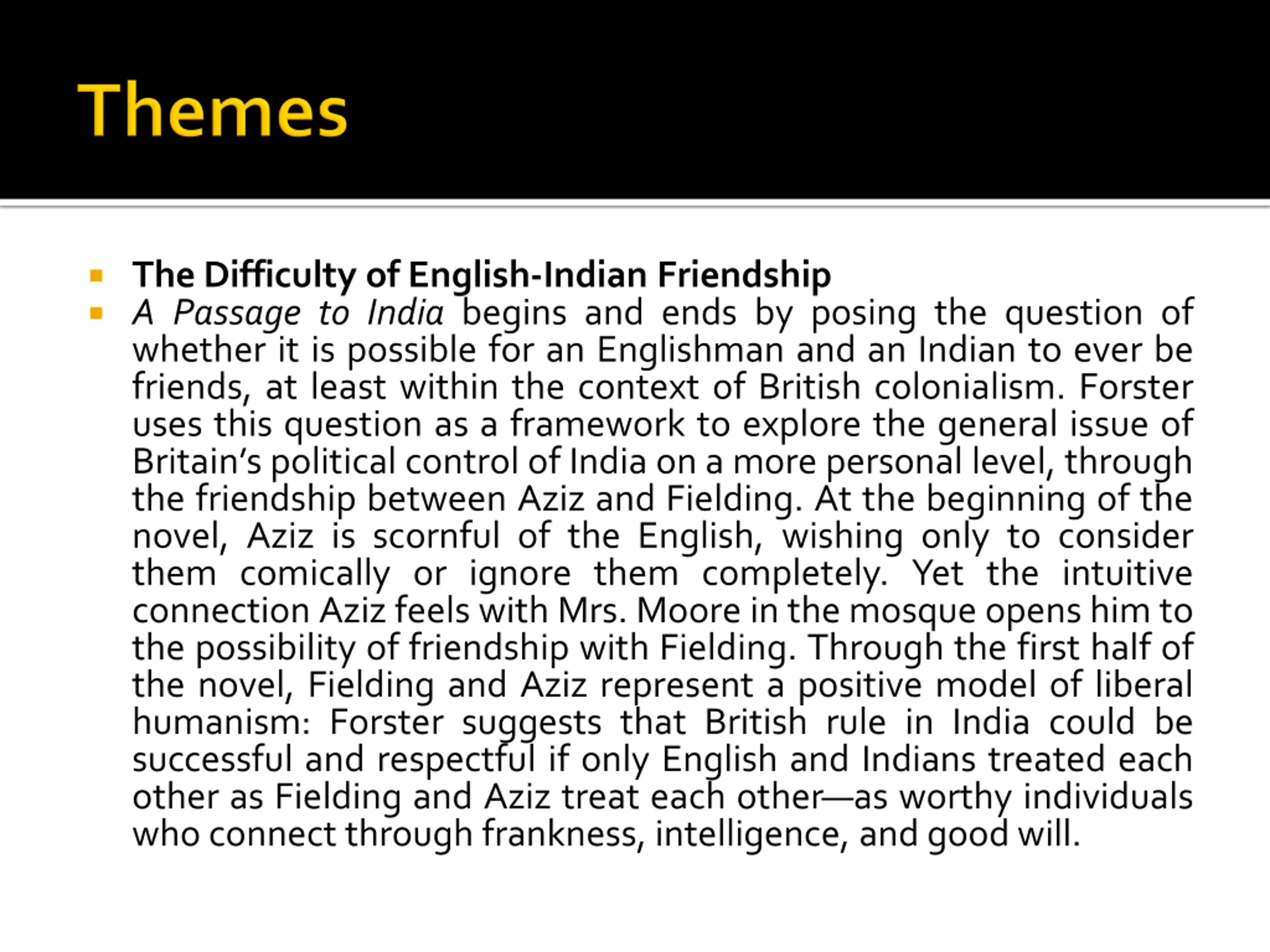 The Difficulty of English-Indian Friendship A Passage to India begins and ends by posing the question of whether it is possible for an Englishman and an Indian to ever be friends, at least within the context of British colonialism. Forster uses this question as a framework to explore the general issue of Britain s political control of India on a more personal level, through the friendship between Aziz and Fielding. At the beginning of the novel, Aziz is scornful of the English, wishing only to consider them comically or ignore them completely. Yet the intuitive connection Aziz feels with Mrs. Moore in the mosque opens him to the possibility of friendship with Fielding. Through the first half of the novel, Fielding and Aziz represent a positive model of liberal humanism: Forster suggests that British rule in India could be successful and respectful if only English and Indians treated each other as Fielding and Aziz treat each other as worthy individuals who connect through frankness, intelligence, andgoodwill.