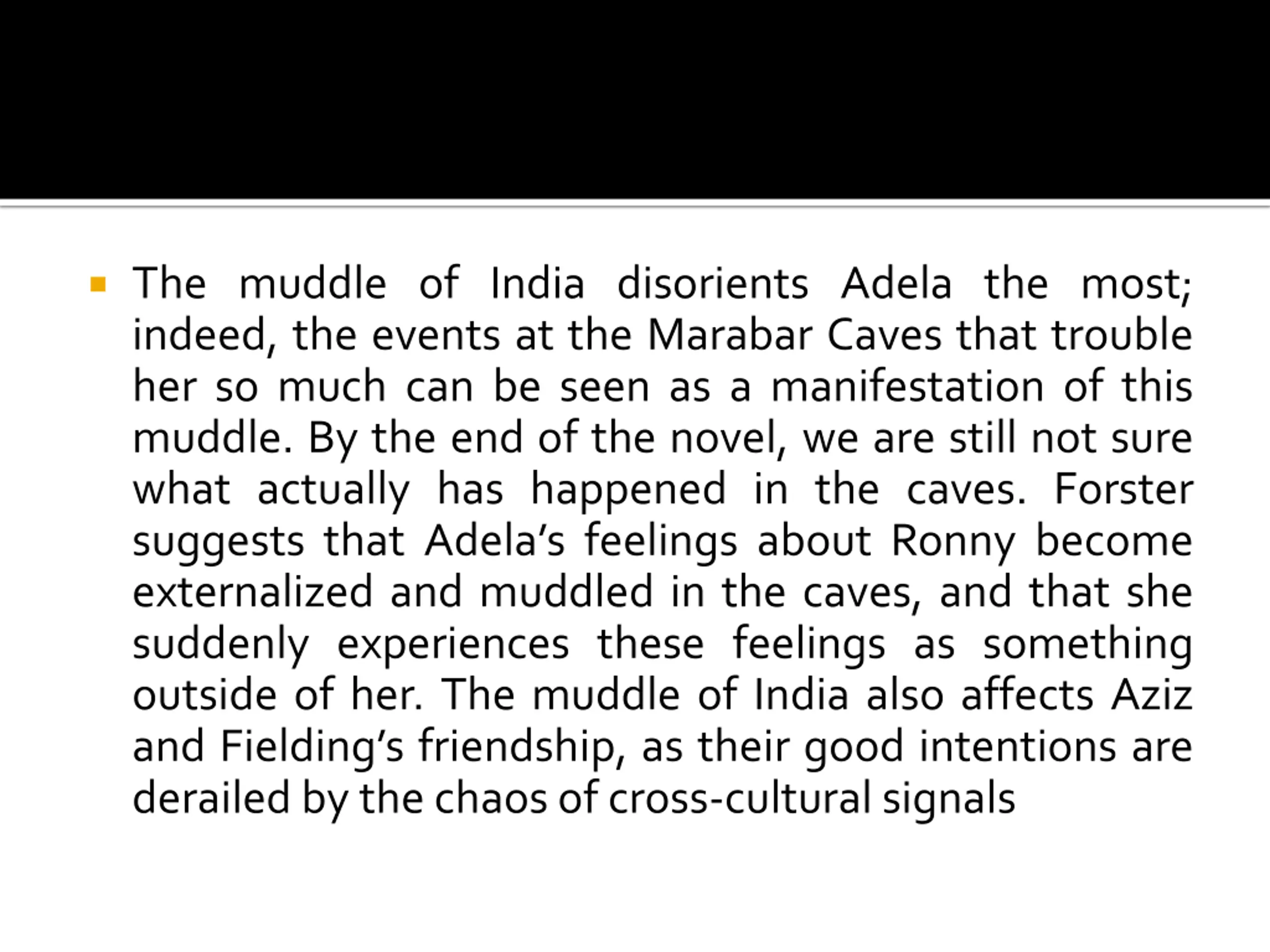 The muddle of India disorients Adela the most; indeed, the events at the Marabar Caves that trouble her so much can be seen as a manifestation of this muddle. By the end of the novel, we are still not sure what actually has happened in the caves. Forster suggests that Adela s feelings about Ronny become externalized and muddled in the caves, and that she suddenly experiences these feelings as something outside of her. The muddle of India also affects Aziz and Fielding s friendship, as their good intentions are derailedby thechaosof cross-cultural signals