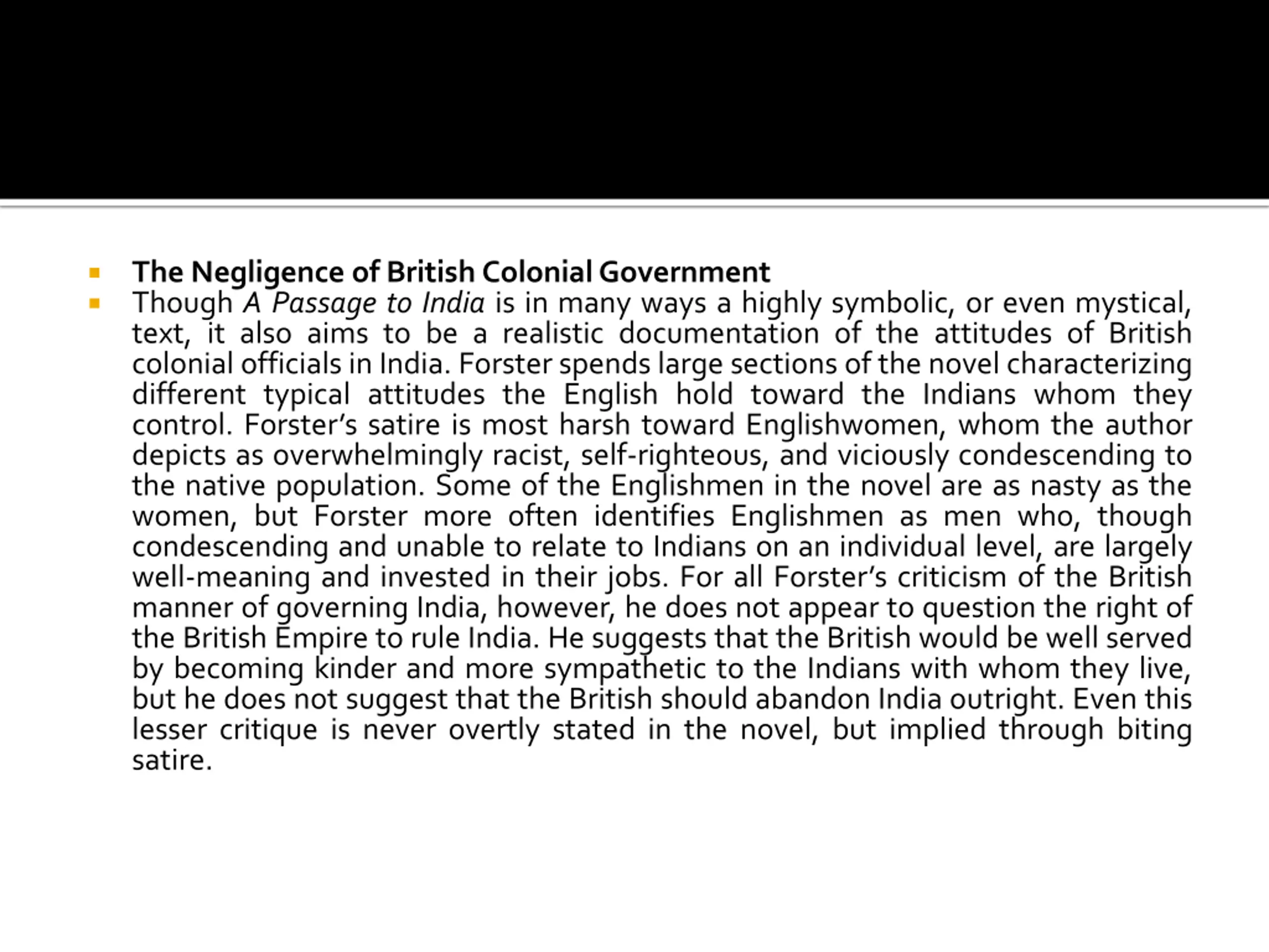 The Negligence of BritishColonialGovernment Though A Passage to India is in many ways a highly symbolic, or even mystical, text, it also aims to be a realistic documentation of the attitudes of British colonial officials in India. Forster spends large sections of the novel characterizing different typical attitudes the English hold toward the Indians whom they control. Forster s satire is most harsh toward Englishwomen, whom the author depicts as overwhelmingly racist, self-righteous, and viciously condescending to the native population. Some of the Englishmen in the novel are as nasty as the women, but Forster more often identifies Englishmen as men who, though condescending and unable to relate to Indians on an individual level, are largely well-meaning and invested in their jobs. For all Forster s criticism of the British manner of governing India, however, he does not appear to question the right of the British Empire to rule India. He suggests that the British would be well served by becoming kinder and more sympathetic to the Indians with whom they live, but he does not suggest that the British should abandon India outright. Even this lesser critique is never overtly stated in the novel, but implied through biting satire.
