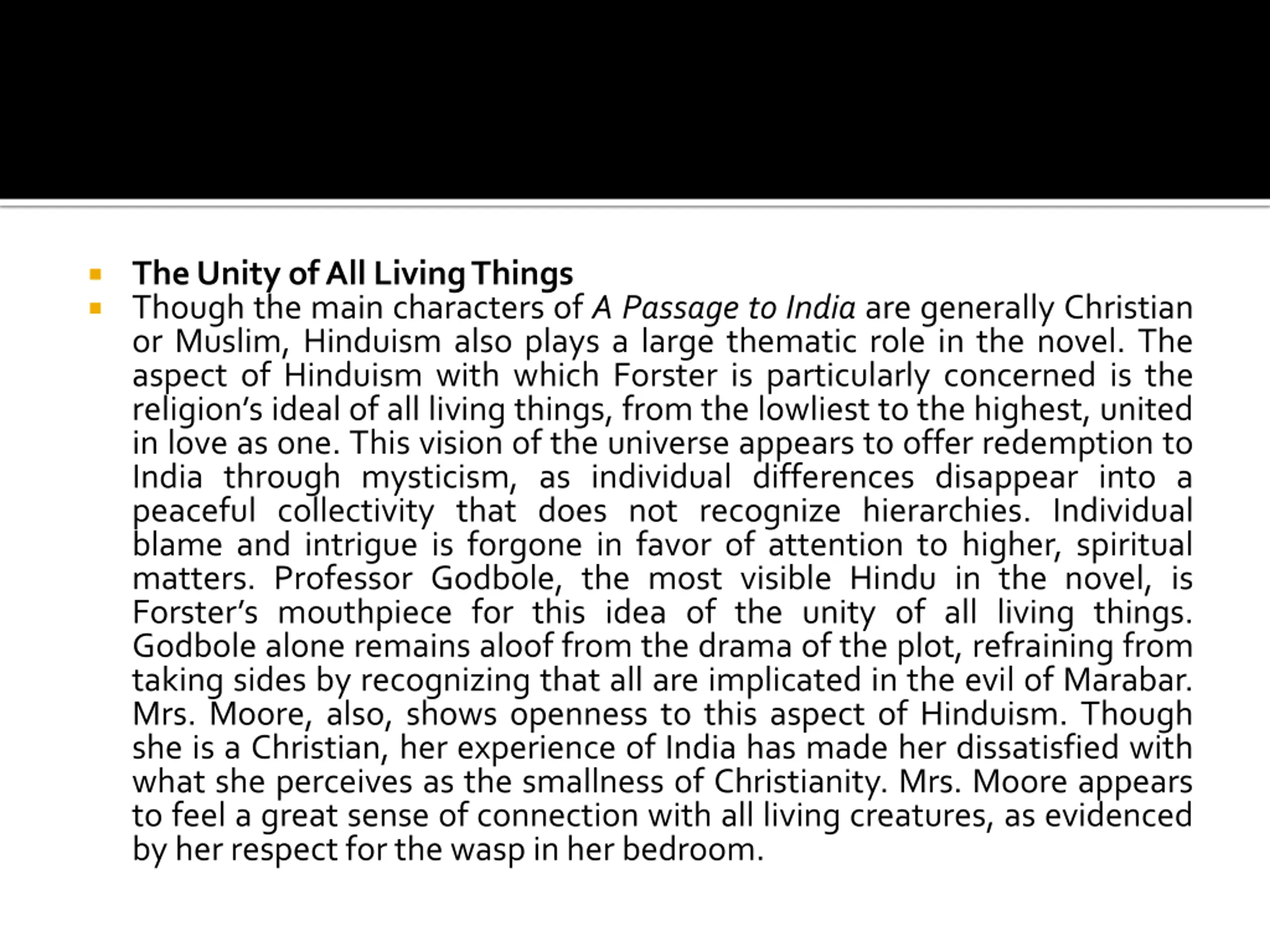 TheUnity ofAllLivingThings Though the main characters of A Passage to India are generally Christian or Muslim, Hinduism also plays a large thematic role in the novel. The aspect of Hinduism with which Forster is particularly concerned is the religion s ideal of all living things, from the lowliest to the highest, united in love as one. This vision of the universe appears to offer redemption to India through mysticism, as individual differences disappear into a peaceful collectivity that does not recognize hierarchies. Individual blame and intrigue is forgone in favor of attention to higher, spiritual matters. Professor Godbole, the most visible Hindu in the novel, is Forster s mouthpiece for this idea of the unity of all living things. Godbole alone remains aloof from the drama of the plot, refraining from taking sides by recognizing that all are implicated in the evil of Marabar. Mrs. Moore, also, shows openness to this aspect of Hinduism. Though she is a Christian, her experience of India has made her dissatisfied with what she perceives as the smallness of Christianity. Mrs. Moore appears to feel a great sense of connection with all living creatures, as evidenced by her respectfor thewaspinher bedroom.