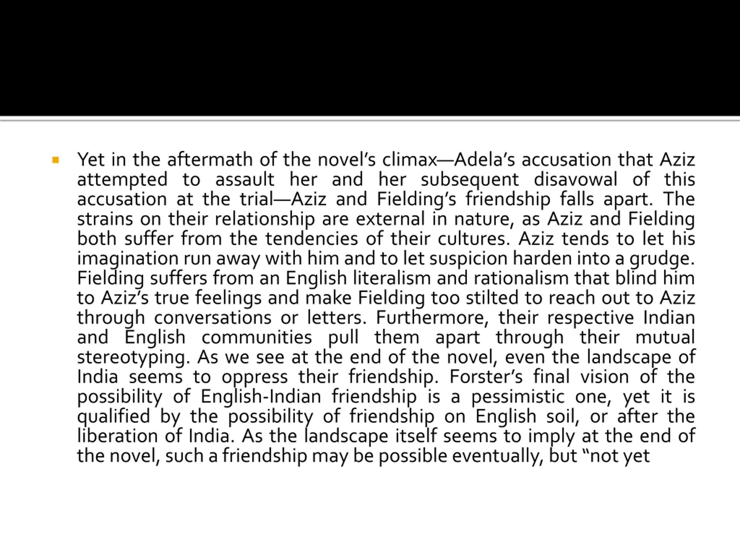 Yet in the aftermath of the novels climaxAdelas accusation that Aziz attempted to assault her and her subsequent disavowal of this accusation at the trial Aziz and Fielding s friendship falls apart. The strains on their relationship are external in nature, as Aziz and Fielding both suffer from the tendencies of their cultures. Aziz tends to let his imagination run away with him and to let suspicion harden into a grudge. Fielding suffers from an English literalism and rationalism that blind him to Aziz s true feelings and make Fielding too stilted to reach out to Aziz through conversations or letters. Furthermore, their respective Indian and English communities pull them apart through their mutual stereotyping. As we see at the end of the novel, even the landscape of India seems to oppress their friendship. Forster s final vision of the possibility of English-Indian friendship is a pessimistic one, yet it is qualified by the possibility of friendship on English soil, or after the liberation of India. As the landscape itself seems to imply at the end of the novel,suchafriendshipmay be possibleeventually,but notyet