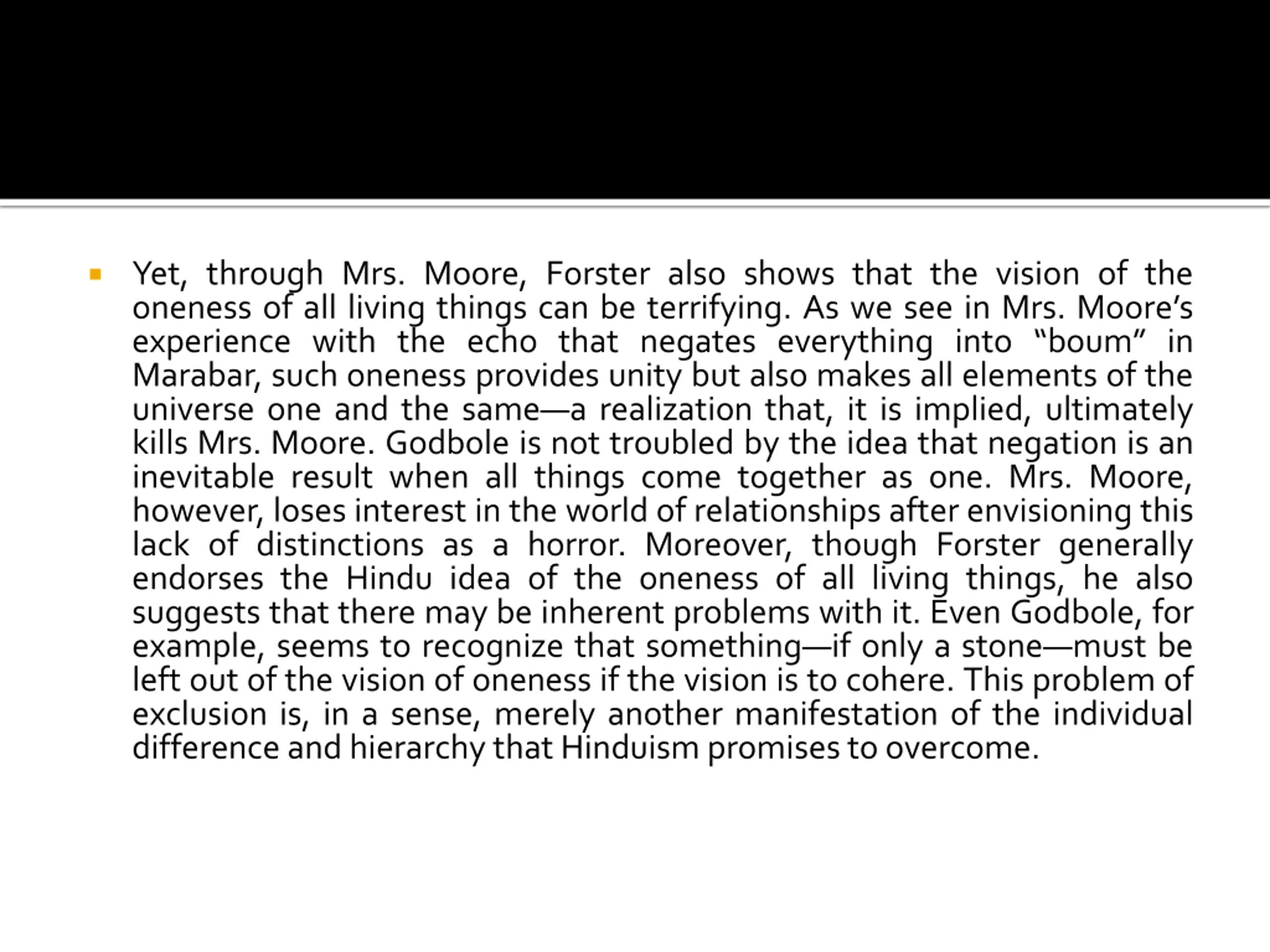 Yet, through Mrs. Moore, Forster also shows that the vision of the oneness of all living things can be terrifying. As we see in Mrs. Moore s experience with the echo that negates everything into boum in Marabar, such oneness provides unity but also makes all elements of the universe one and the same a realization that, it is implied, ultimately kills Mrs. Moore. Godbole is not troubled by the idea that negation is an inevitable result when all things come together as one. Mrs. Moore, however, loses interest in the world of relationships after envisioning this lack of distinctions as a horror. Moreover, though Forster generally endorses the Hindu idea of the oneness of all living things, he also suggests that there may be inherent problems with it. Even Godbole, for example, seems to recognize that something if only a stone must be left out of the vision of oneness if the vision is to cohere. This problem of exclusion is, in a sense, merely another manifestation of the individual difference andhierarchythatHinduism promisestoovercome.