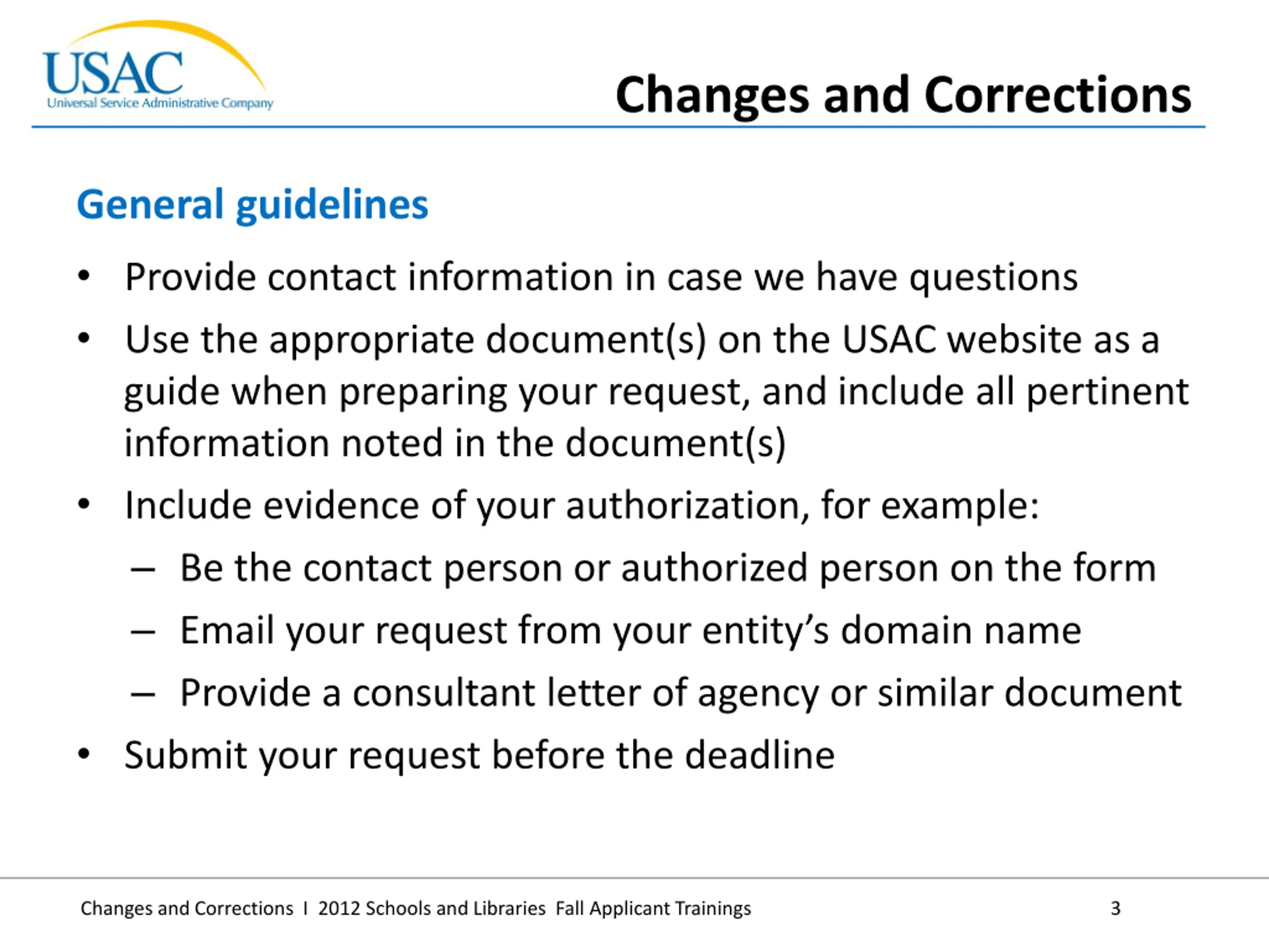 Changes and Corrections Overview Ministerial and clerical errors SPIN changes Service substitutions Invoice deadline extensions Service delivery deadline extensions Changes and Corrections I 2012 Schools and Libraries Fall Applicant Trainings 2