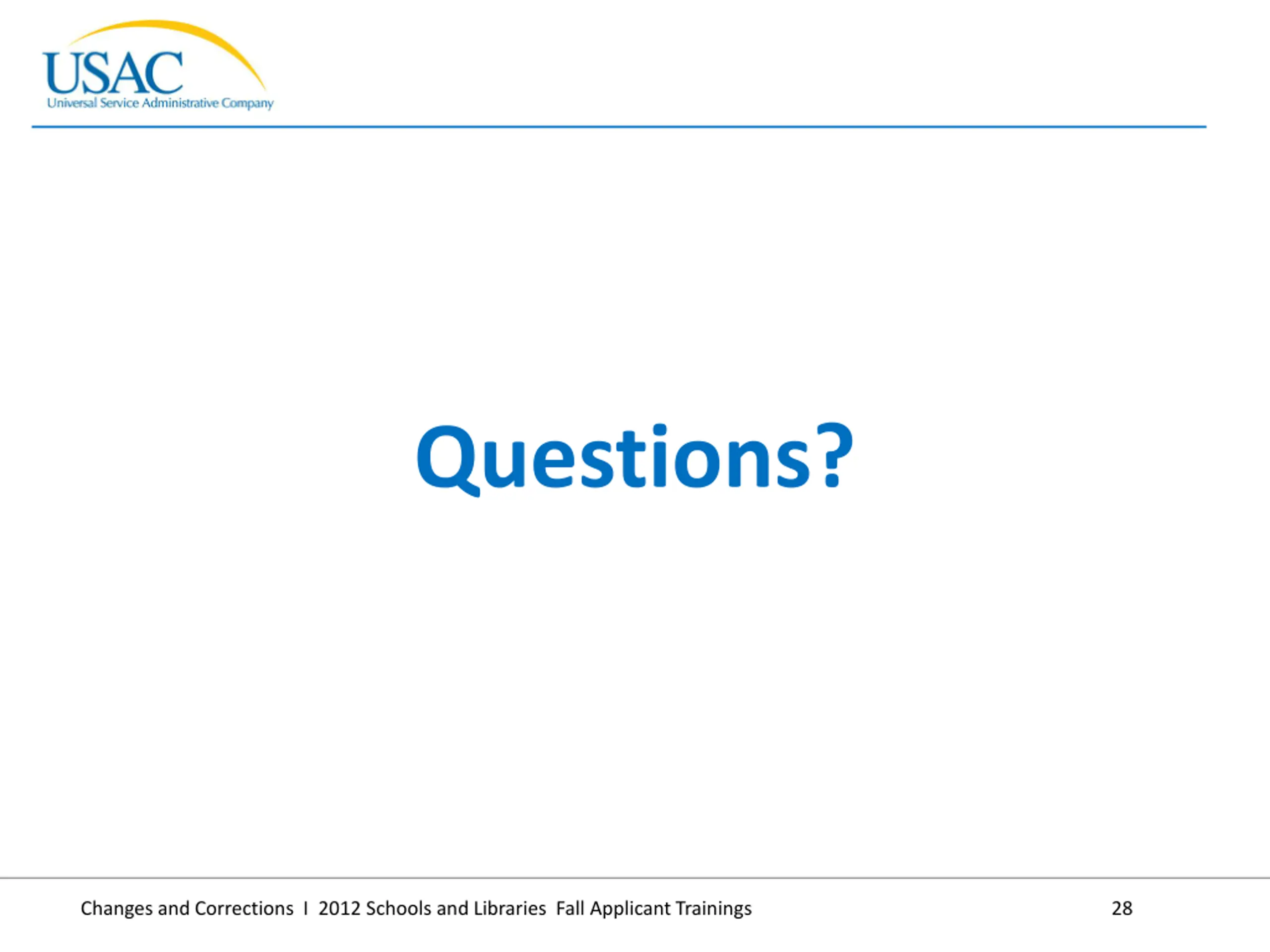Questions? Changes and Corrections I 2012 Schools and Libraries Fall Applicant Trainings 28