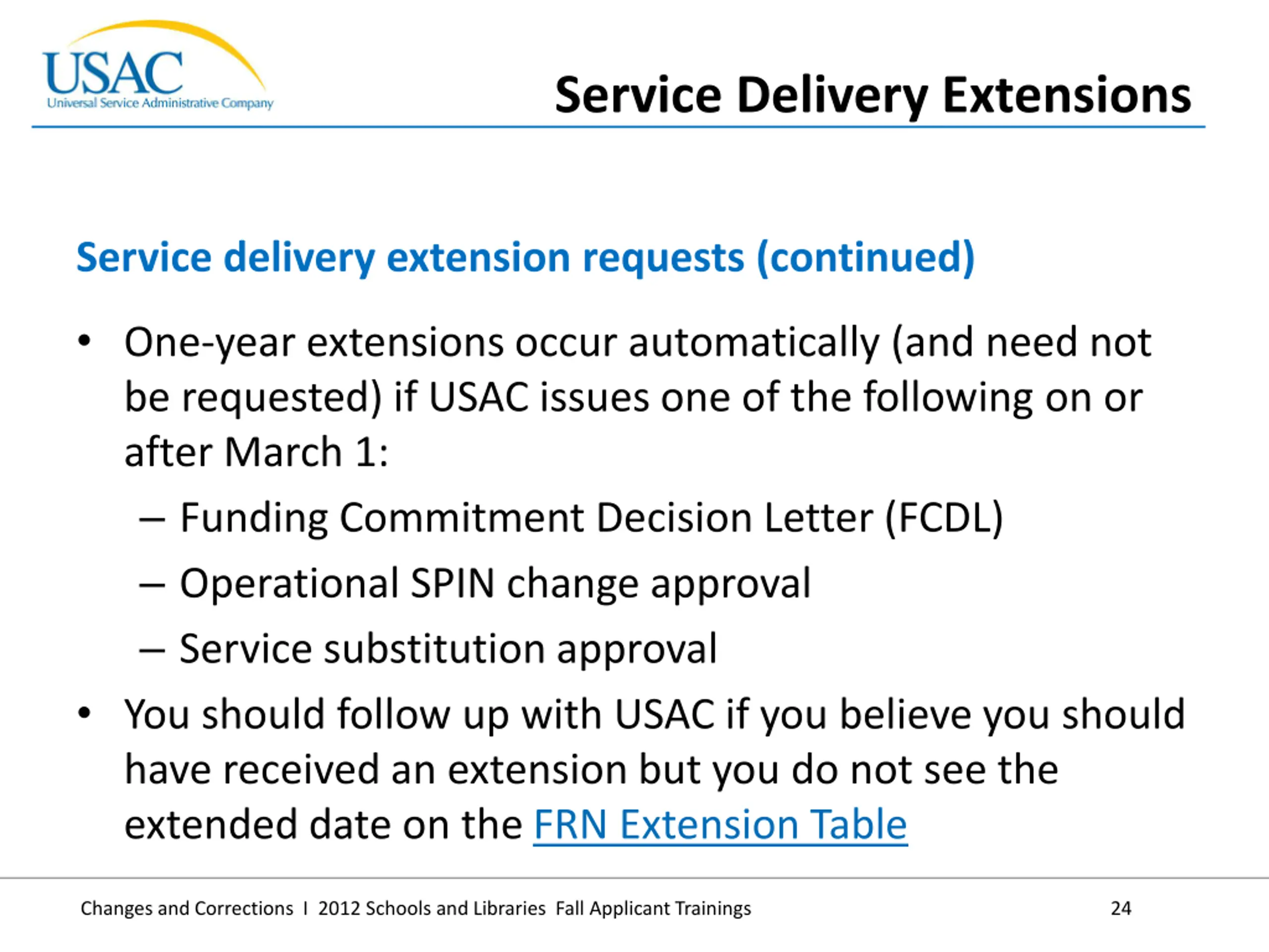 Service Delivery Extensions Service delivery extension requests (continued) One-year extensions occur automatically (and need not be requested) if USAC issues one of the following on or after March 1: Funding Commitment Decision Letter (FCDL) Operational SPIN change approval Service substitution approval You should follow up with USAC if you believe you should have received an extension but you do not see the extended date on the FRN Extension Table Changes and Corrections I 2012 Schools and Libraries Fall Applicant Trainings 24