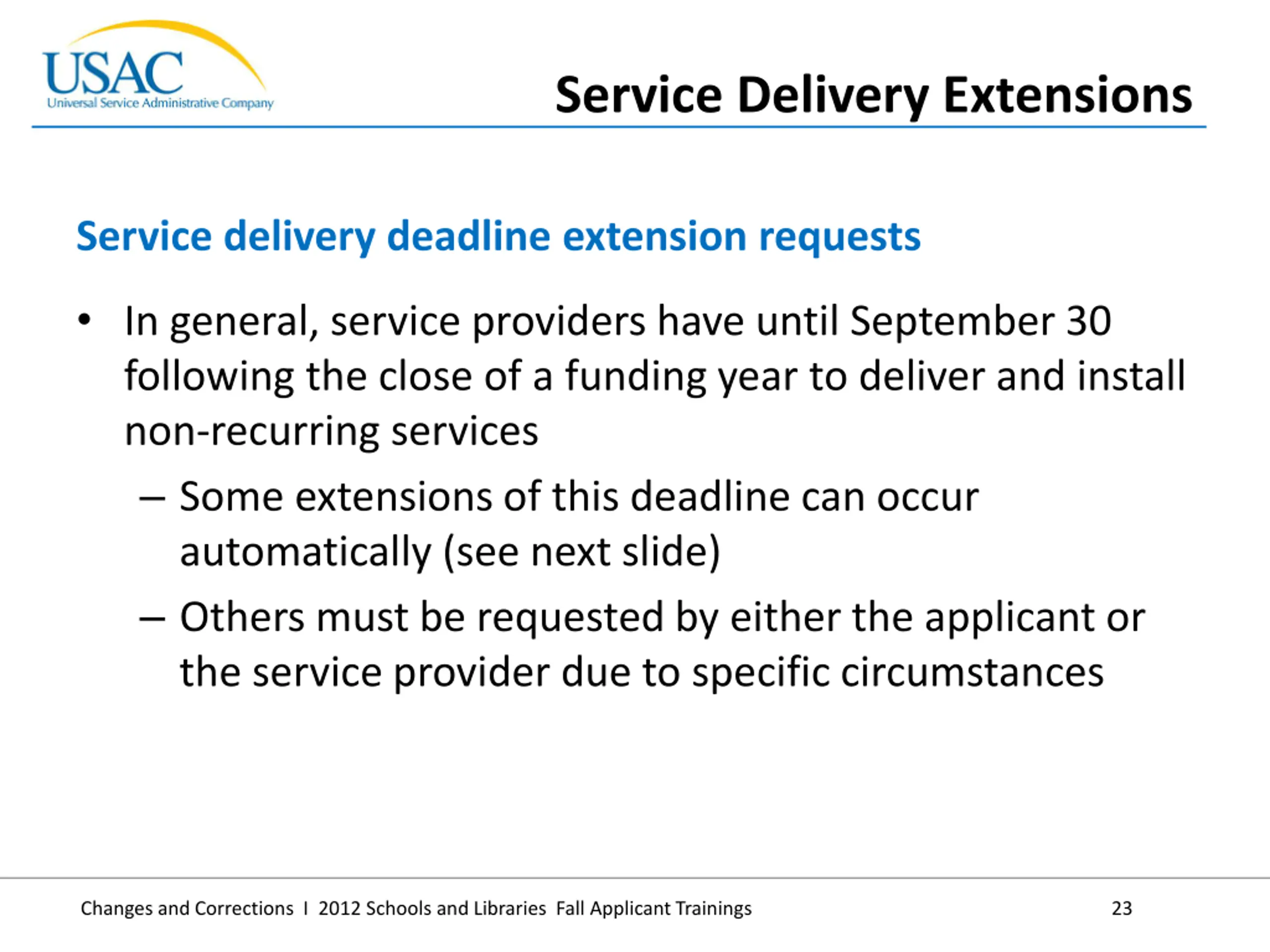 Service Delivery Extensions Don t forget to include A list of specific information to include can be found in the Service Delivery document on the USAC website The applicant or service provider must provide documentation or other support for either the service provider s inability or unwillingness to complete delivery and installation Changes and Corrections I 2012 Schools and Libraries Fall Applicant Trainings 27
