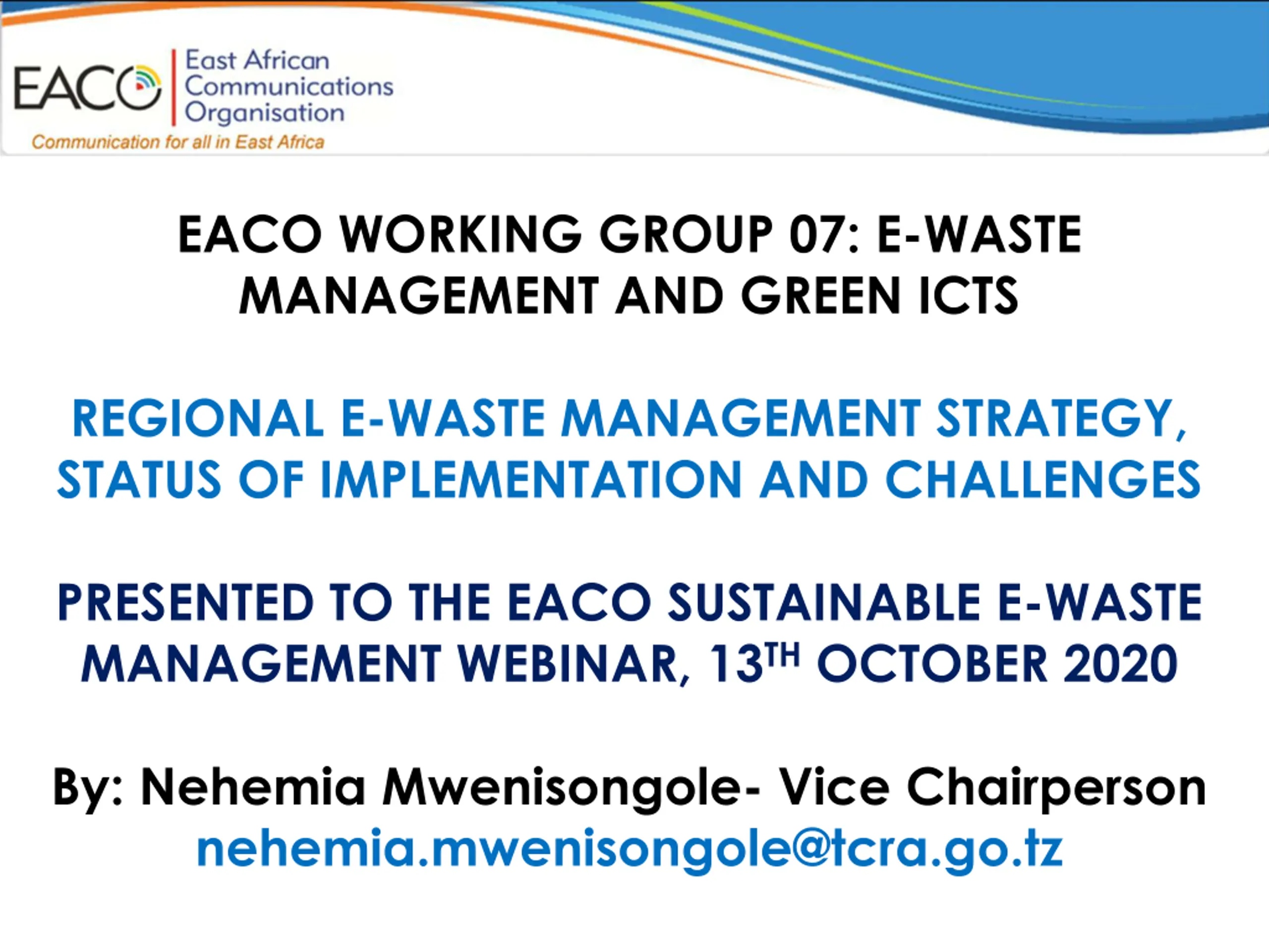 EACO WORKING GROUP 07: E-WASTE MANAGEMENT AND GREEN ICTS REGIONAL E-WASTE MANAGEMENT STRATEGY, STATUS OF IMPLEMENTATION AND CHALLENGES PRESENTED TO THE EACO SUSTAINABLE E-WASTE MANAGEMENT WEBINAR, 13THOCTOBER 2020 By: Nehemia Mwenisongole- Vice Chairperson nehemia.mwenisongole@tcra.go.tz