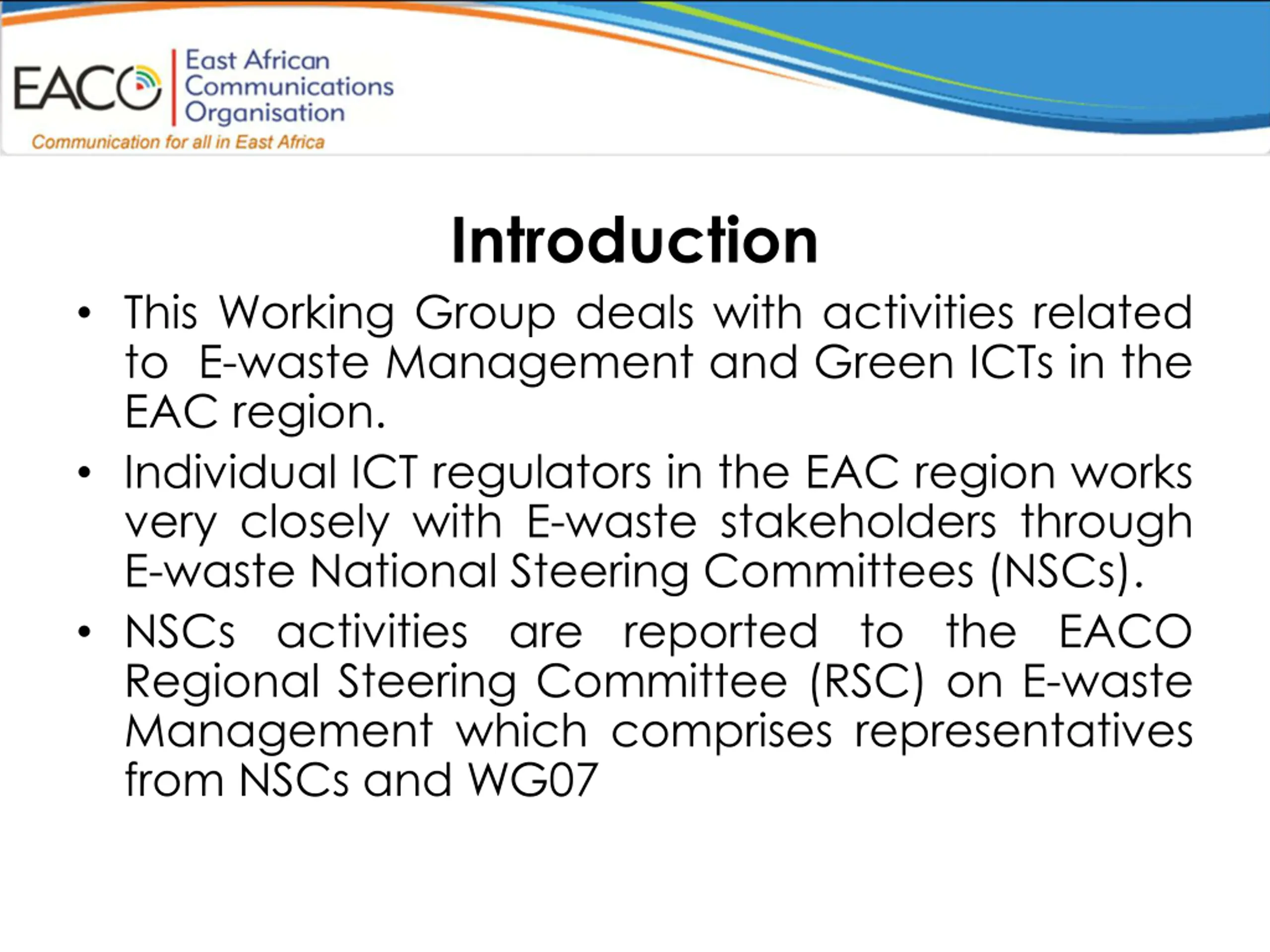 Introduction This Working Group deals with activities related to E-waste Management and Green ICTs in the EAC region. Individual ICT regulators in the EAC region works very closely with E-waste stakeholders through E-waste National Steering Committees (NSCs). NSCs activities are reported to the EACO Regional Steering Committee (RSC) on E-waste Management which comprises representatives from NSCs and WG07