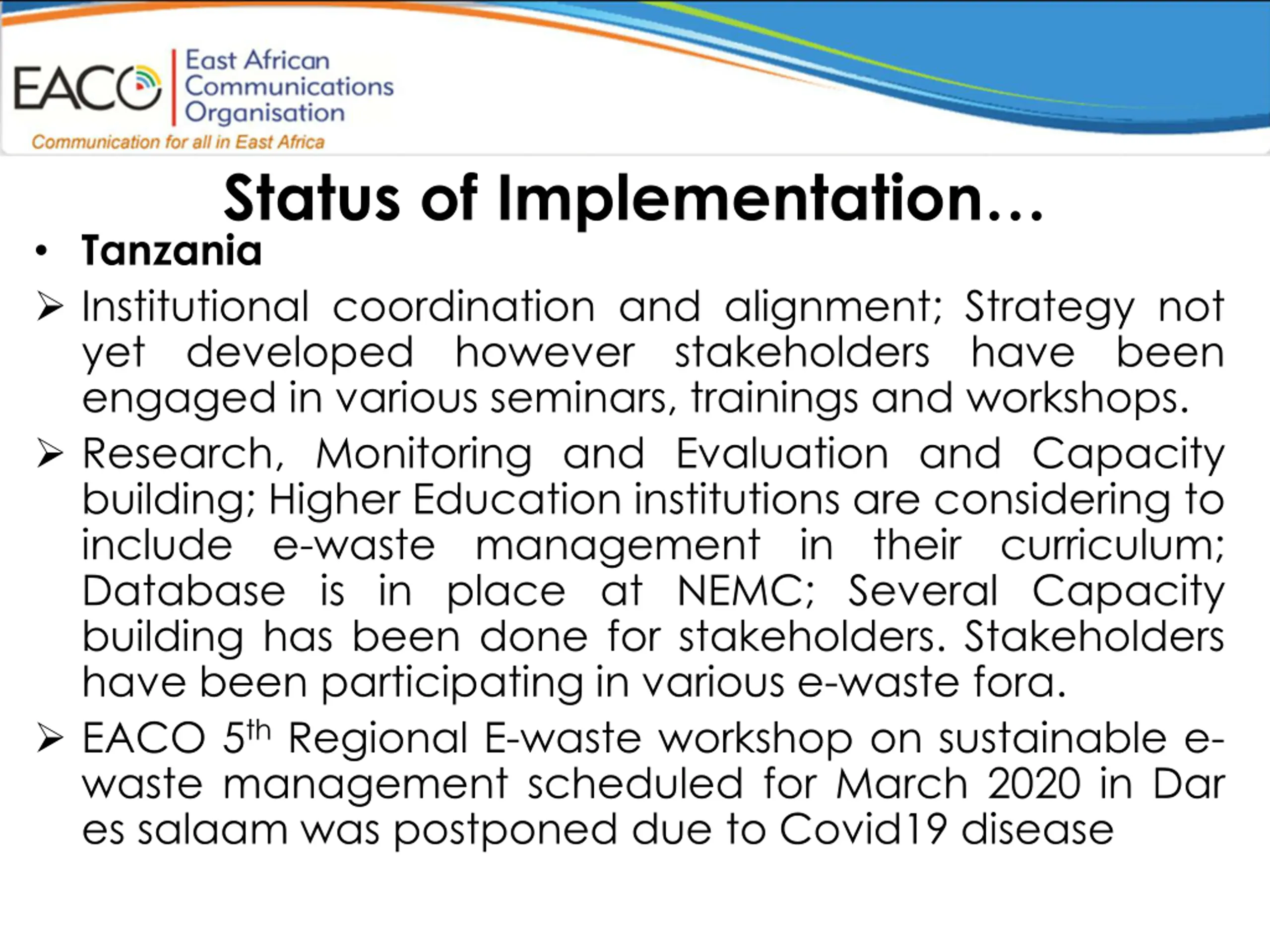 Status of Implementation Tanzania Institutional coordination and alignment; Strategy not yet developed however engaged in various seminars, trainings and workshops. Research, Monitoring and Evaluation and Capacity building; Higher Education institutions are considering to include e-waste management Database is in place at NEMC; Several Capacity building has been done for stakeholders. Stakeholders have been participating in various e-waste fora. EACO 5thRegional E-waste workshop on sustainable e- waste management scheduled for March 2020 in Dar es salaam was postponed due to Covid19 disease stakeholders have been in their curriculum;