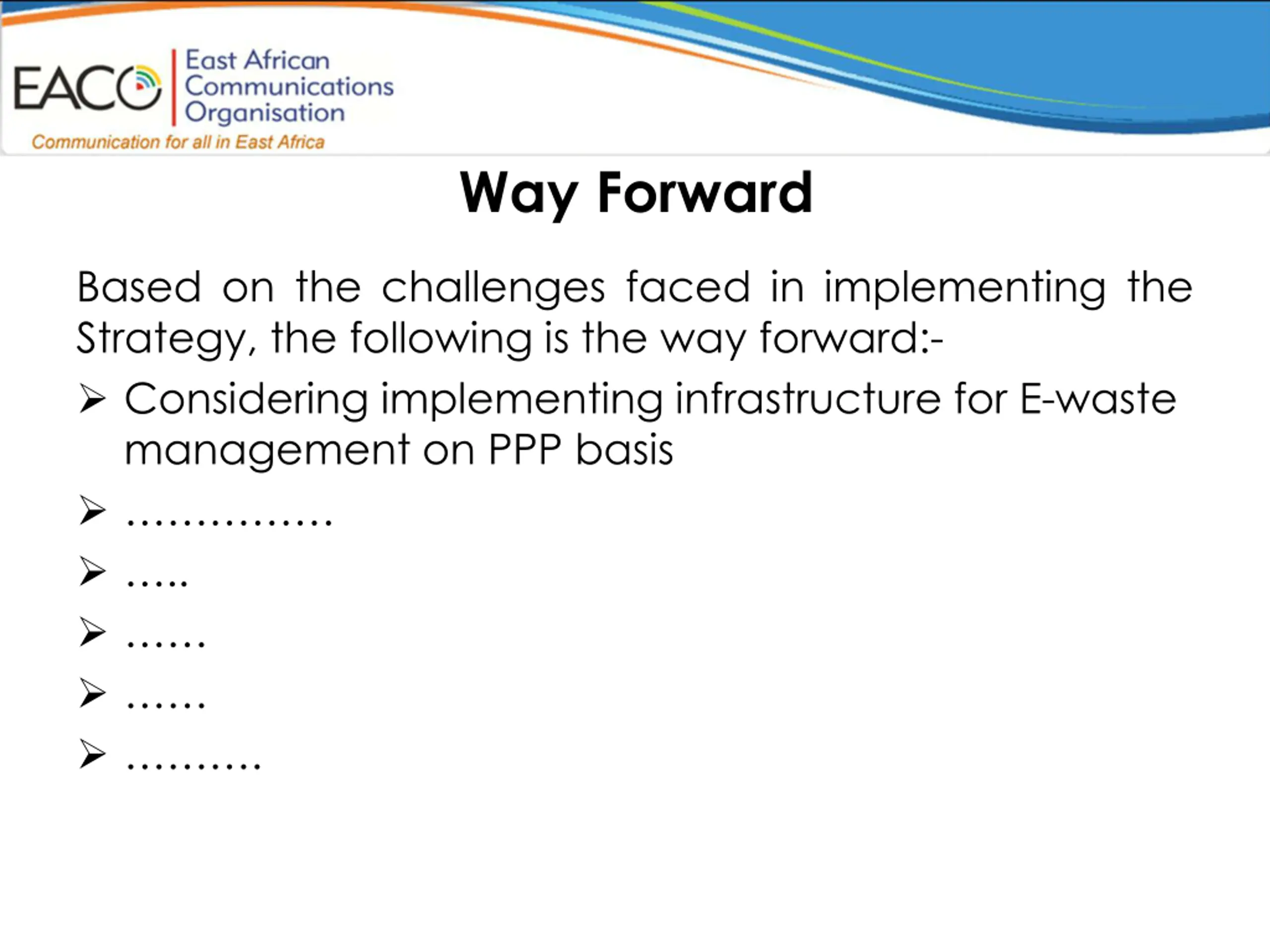 Way Forward Based on the challenges faced in implementing the Strategy, the following is the way forward:- Considering implementing infrastructure for E-waste management on PPP basis .. .