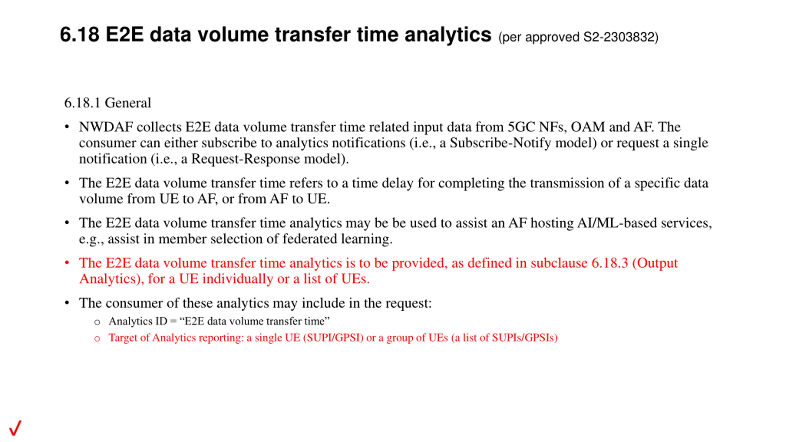 6.18 E2E data volume transfer time analytics (per approved S2-2303832) 6.18.1 General NWDAF collects E2E data volume transfer time related input data from 5GC NFs, OAM and AF. The consumer can either subscribe to analytics notifications (i.e., a Subscribe-Notify model) or request a single notification (i.e., a Request-Response model). The E2E data volume transfer time refers to a time delay for completing the transmission of a specific data volume from UE to AF, or from AF to UE. The E2E data volume transfer time analytics may be be used to assist an AF hosting AI/ML-based services, e.g., assist in member selection of federated learning. The E2E data volume transfer time analytics is to be provided, as defined in subclause 6.18.3 (Output Analytics), for a UE individually or a list of UEs. The consumer of these analytics may include in the request: o Analytics ID = E2E data volume transfer time o Target of Analytics reporting: a single UE (SUPI/GPSI) or a group of UEs (a list of SUPIs/GPSIs)