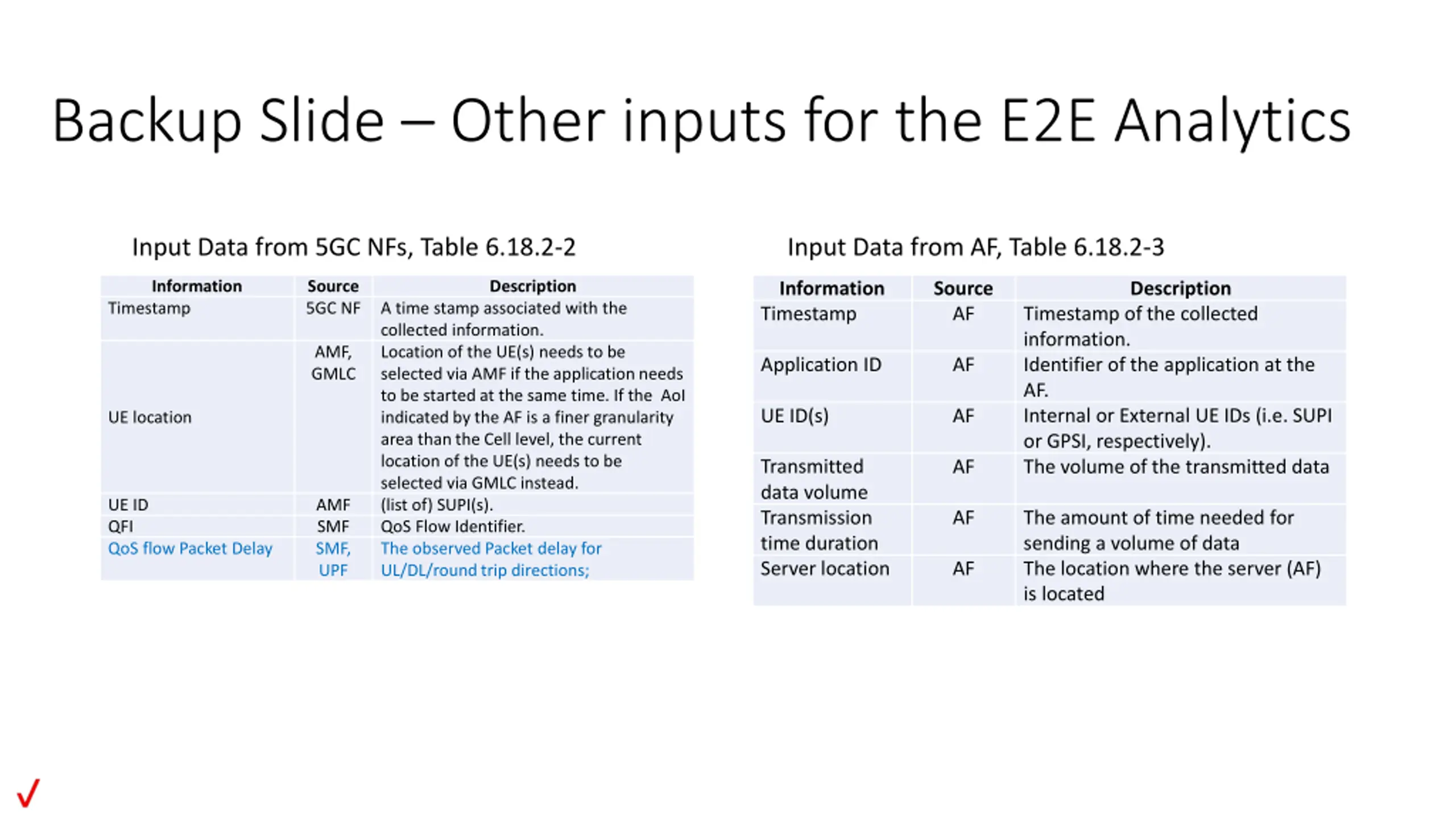 Backup Slide Other inputs for the E2E Analytics Input Data from 5GC NFs, Table 6.18.2-2 Input Data from AF, Table 6.18.2-3 Information Timestamp Source 5GC NF A time stamp associated with the collected information. AMF, GMLC selected via AMF if the application needs to be started at the same time. If the AoI indicated by the AF is a finer granularity area than the Cell level, the current location of the UE(s) needs to be selected via GMLC instead. AMF (list of) SUPI(s). SMF QoS Flow Identifier. SMF, UPF UL/DL/round trip directions; Description Information Timestamp Source AF Description Timestamp of the collected information. Identifier of the application at the AF. Internal or External UE IDs (i.e. SUPI or GPSI, respectively). The volume of the transmitted data Location of the UE(s) needs to be Application ID AF UE ID(s) AF UE location Transmitted data volume Transmission time duration Server location AF UE ID QFI QoS flow Packet Delay The amount of time needed for sending a volume of data The location where the server (AF) is located AF The observed Packet delay for AF