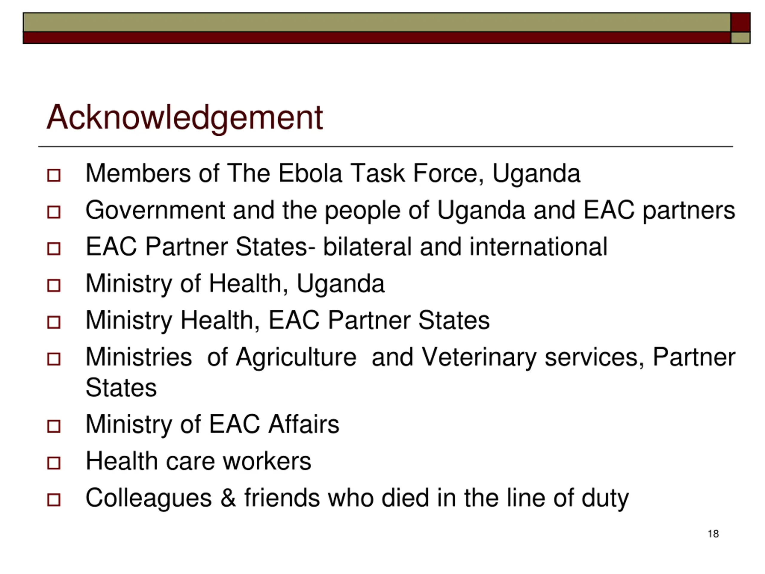 Acknowledgement Members of The Ebola Task Force, Uganda Government and the people of Uganda and EAC partners EAC Partner States- bilateral and international Ministry of Health, Uganda Ministry Health, EAC Partner States Ministries of Agriculture and Veterinary services, Partner States Ministry of EAC Affairs Health care workers Colleagues & friends who died in the line of duty 18