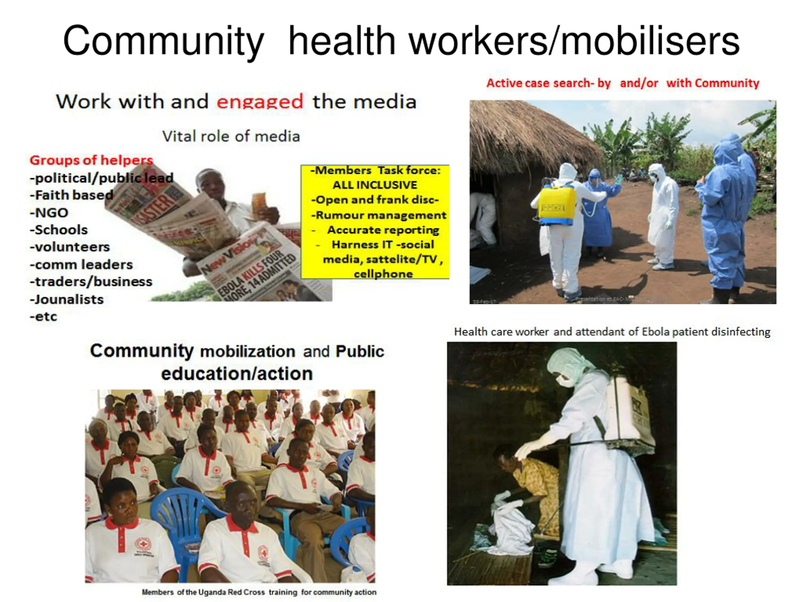 Tools for community mobilisation Mass media e.g. radio/tv .. Home visits door to door Discussion groups, rallies Cascade training to districts..villages IEC Materials: posters, Rumour management: work with media, press
