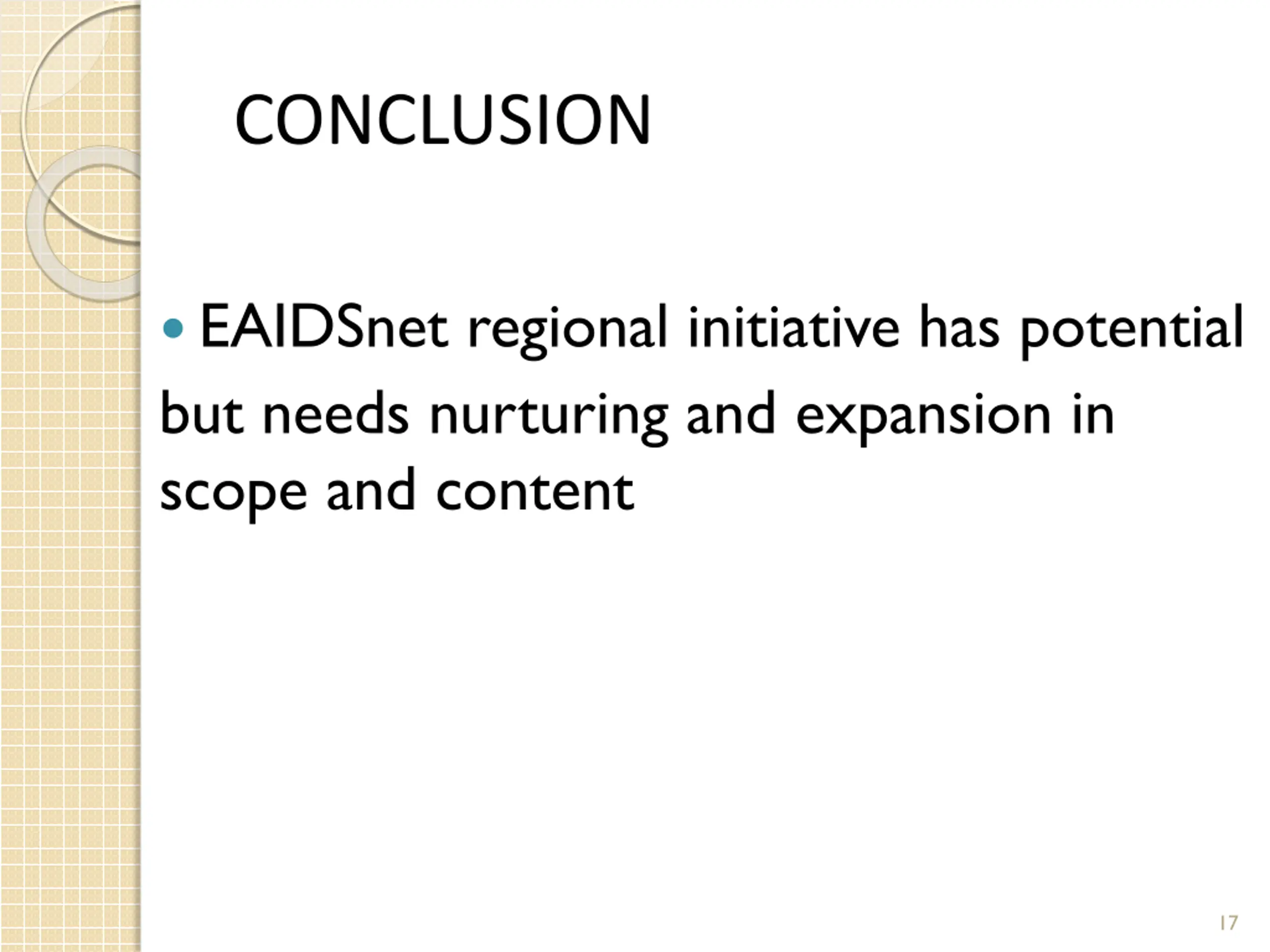 CONCLUSION EAIDSnet regional initiative has potential but needs nurturing and expansion in scope and content 17