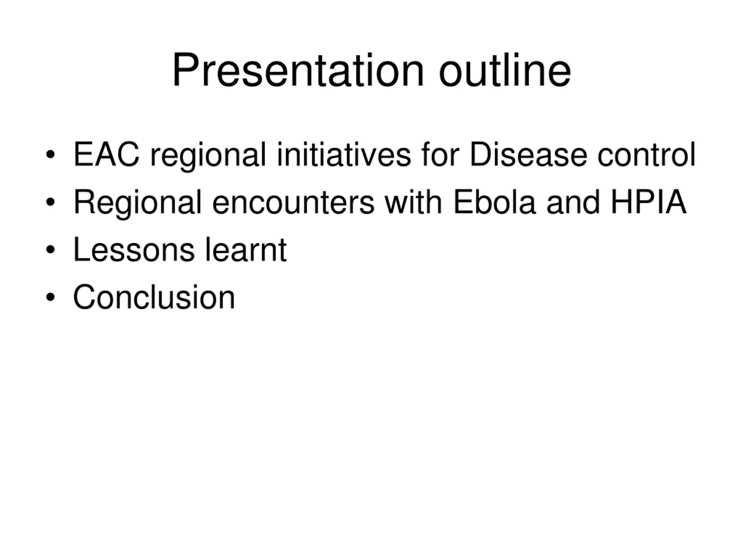 Presentation outline EAC regional initiatives for Disease control Regional encounters with Ebola and HPIA Lessons learnt Conclusion