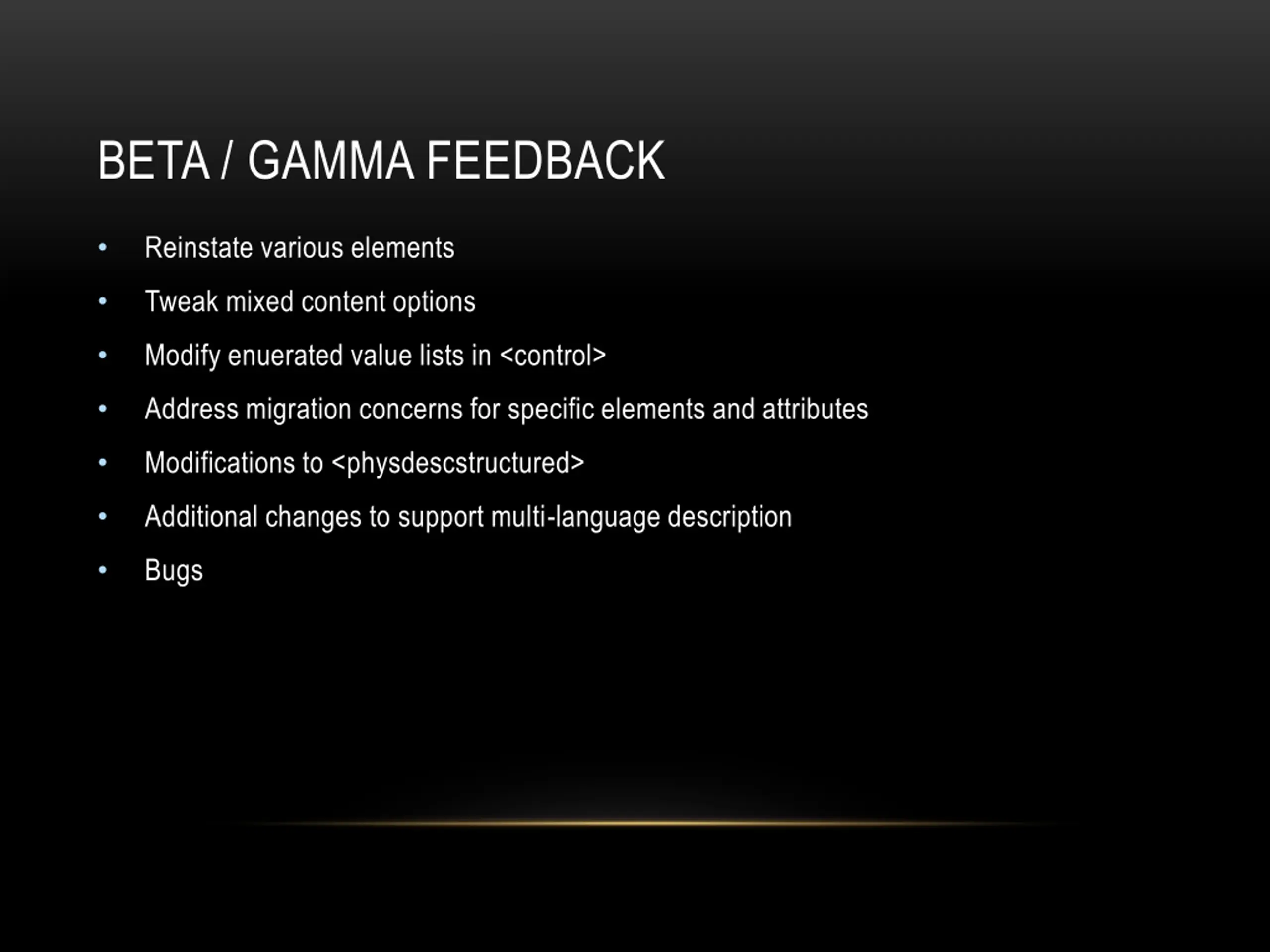 BETA / GAMMA FEEDBACK Reinstate various elements Tweak mixed content options Modify enuerated value lists in <control> Address migration concerns for specific elements and attributes Modifications to <physdescstructured> Additional changes to support multi-language description Bugs