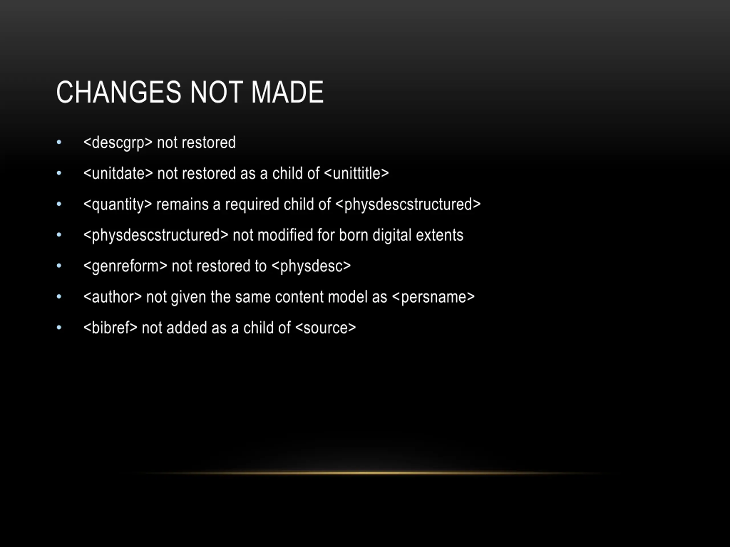 CHANGES NOT MADE <descgrp> not restored <unitdate> not restored as a child of <unittitle> <quantity> remains a required child of <physdescstructured> <physdescstructured> not modified for born digital extents <genreform> not restored to <physdesc> <author> not given the same content model as <persname> <bibref> not added as a child of <source>