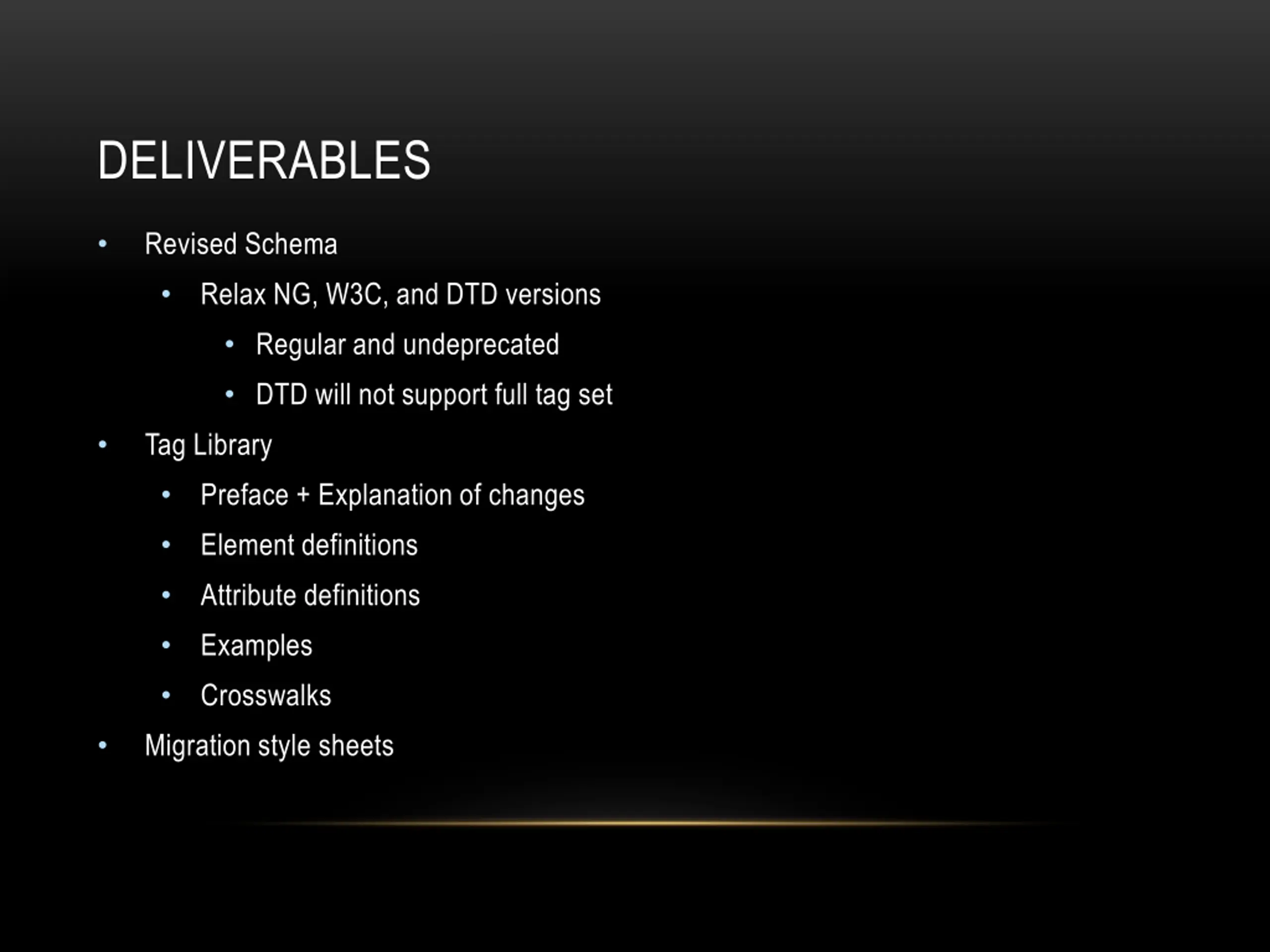DELIVERABLES Revised Schema Relax NG, W3C, and DTD versions Regular and undeprecated DTD will not support full tag set Tag Library Preface + Explanation of changes Element definitions Attribute definitions Examples Crosswalks Migration style sheets