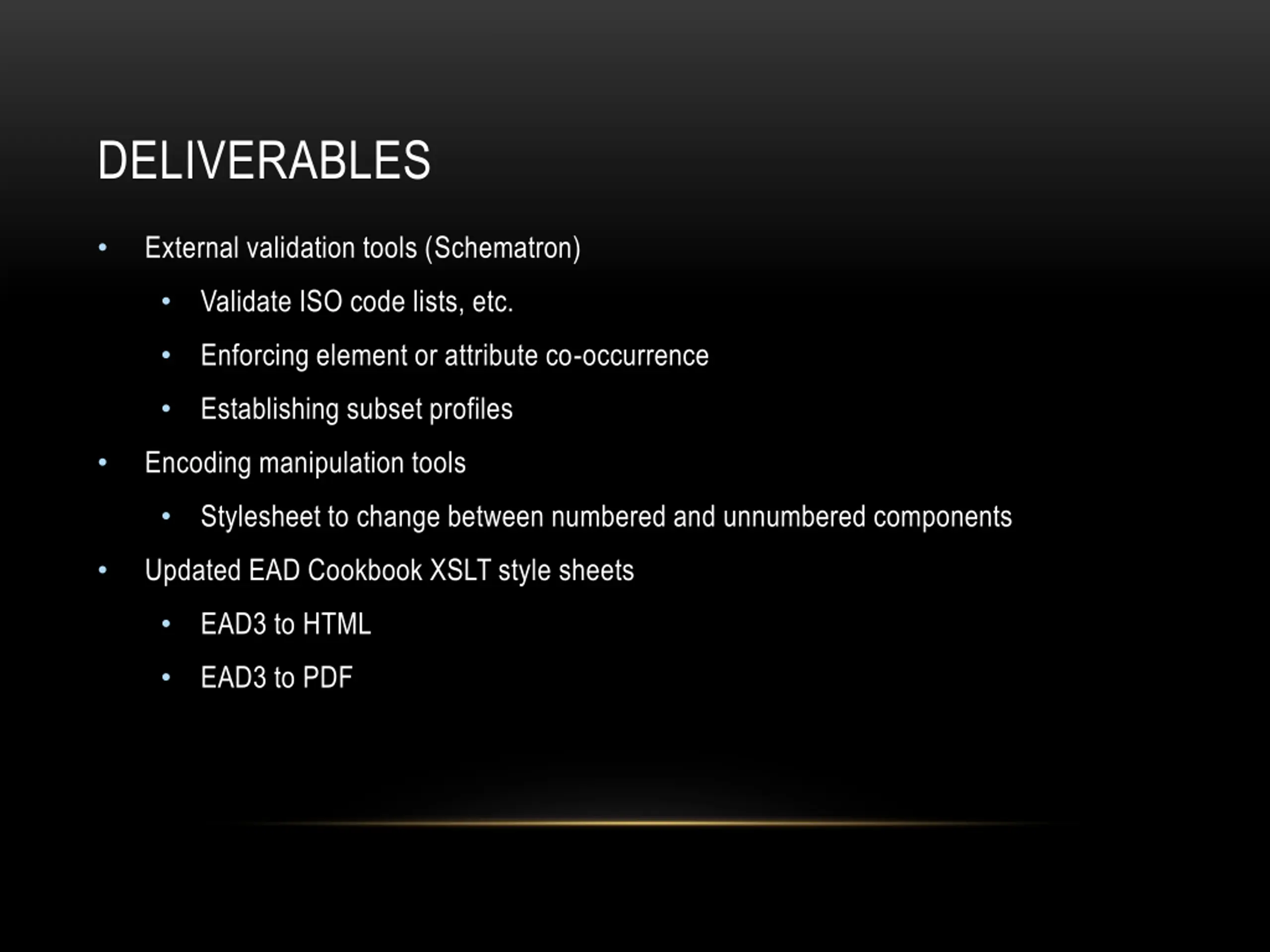 DELIVERABLES External validation tools (Schematron) Validate ISO code lists, etc. Enforcing element or attribute co-occurrence Establishing subset profiles Encoding manipulation tools Stylesheet to change between numbered and unnumbered components Updated EAD Cookbook XSLT style sheets EAD3 to HTML EAD3 to PDF