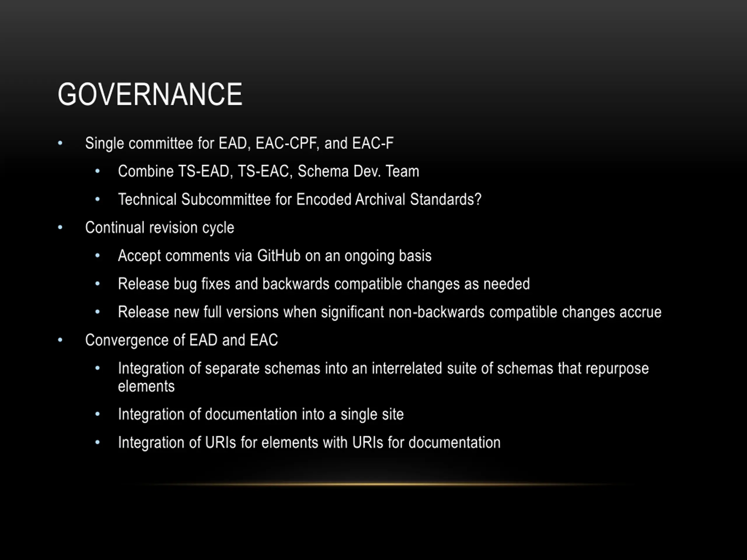 GOVERNANCE Single committee for EAD, EAC-CPF, and EAC-F Combine TS-EAD, TS-EAC, Schema Dev. Team Technical Subcommittee for Encoded Archival Standards? Continual revision cycle Accept comments via GitHub on an ongoing basis Release bug fixes and backwards compatible changes as needed Release new full versions when significant non-backwards compatible changes accrue Convergence of EAD and EAC Integration of separate schemas into an interrelated suite of schemas that repurpose elements Integration of documentation into a single site Integration of URIs for elements with URIs for documentation