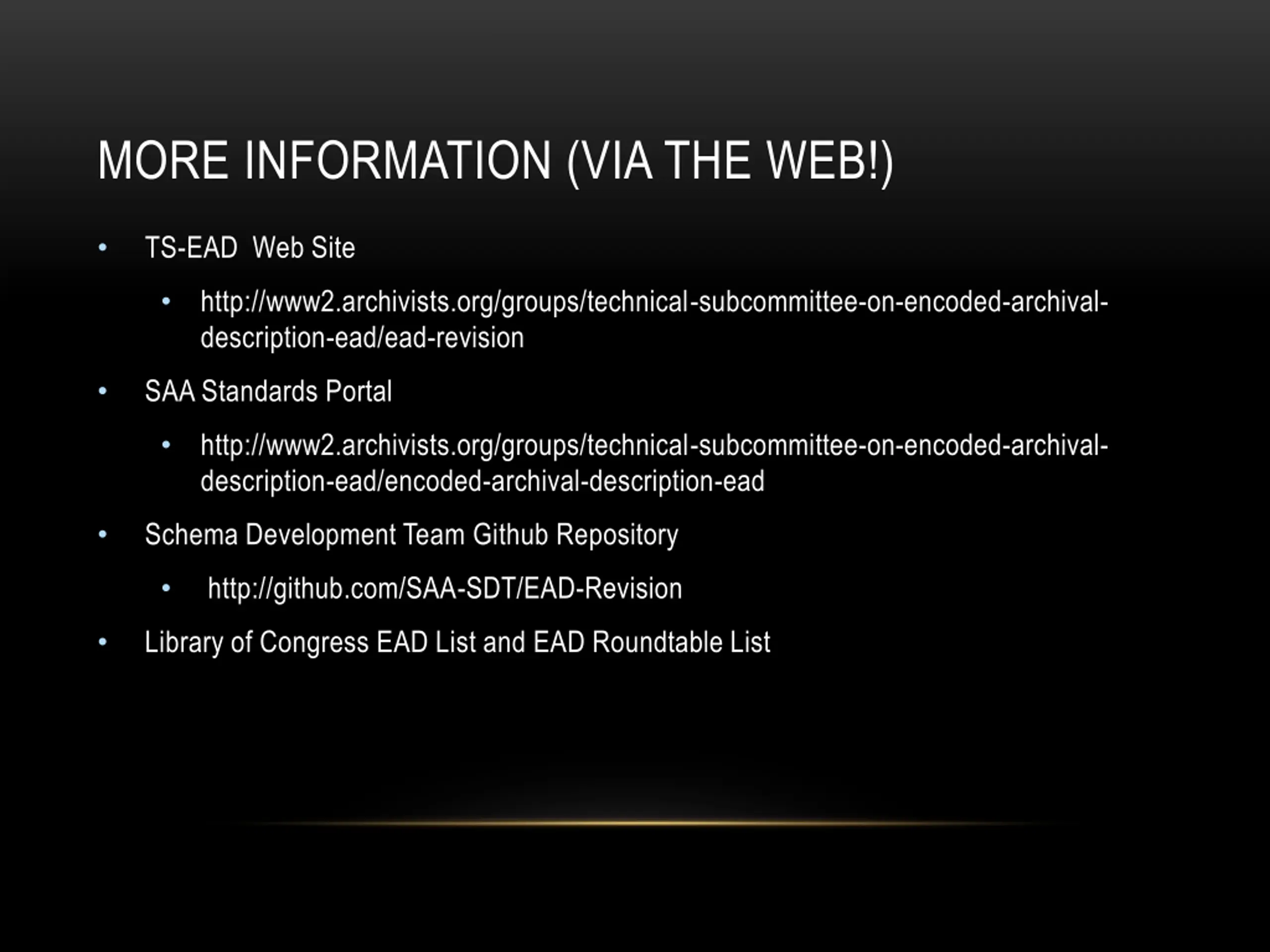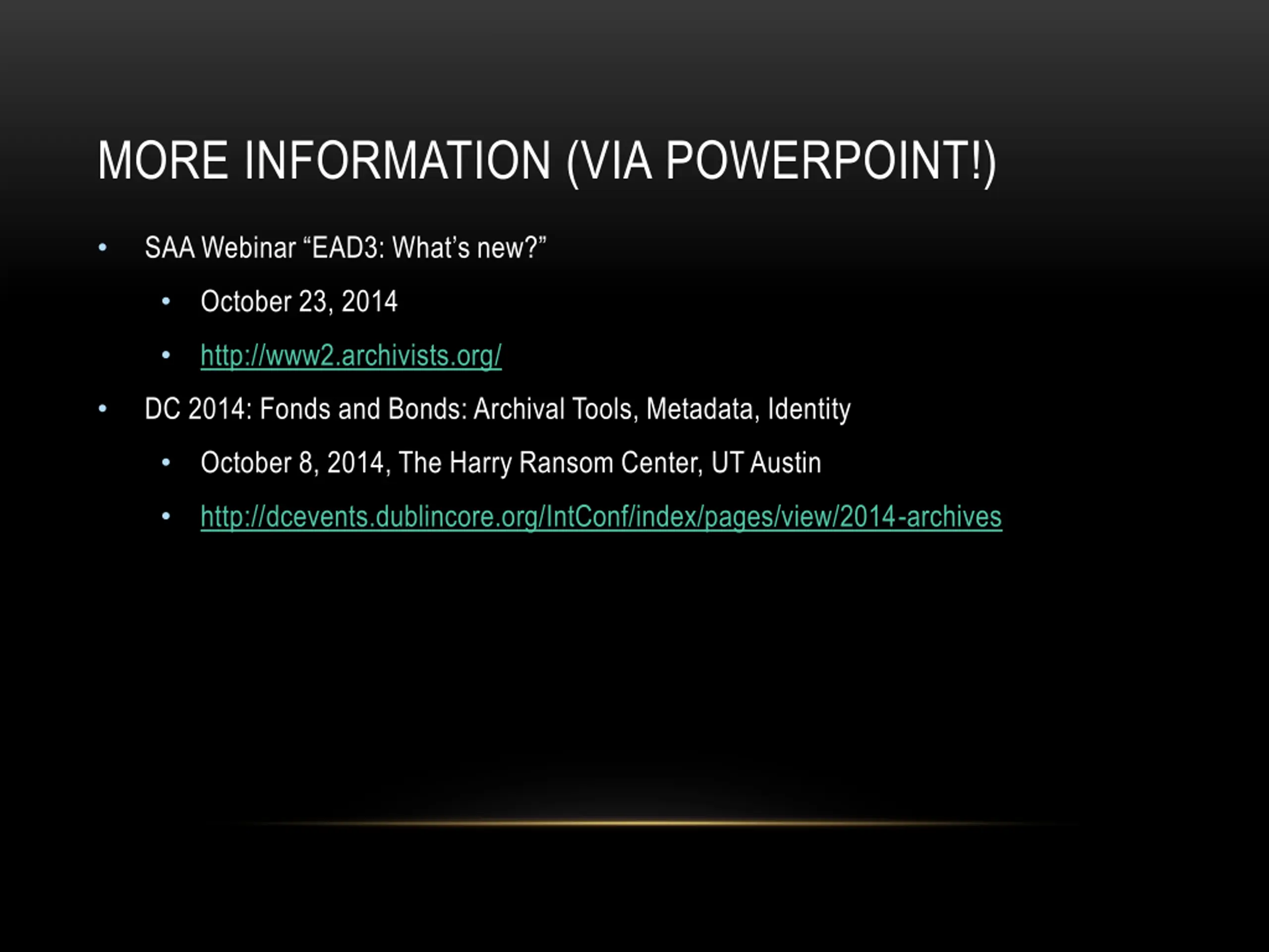 MORE INFORMATION (VIA POWERPOINT!) SAA Webinar EAD3: What s new? October 23, 2014 http://www2.archivists.org/ DC 2014: Fonds and Bonds: Archival Tools, Metadata, Identity October 8, 2014, The Harry Ransom Center, UT Austin http://dcevents.dublincore.org/IntConf/index/pages/view/2014-archives