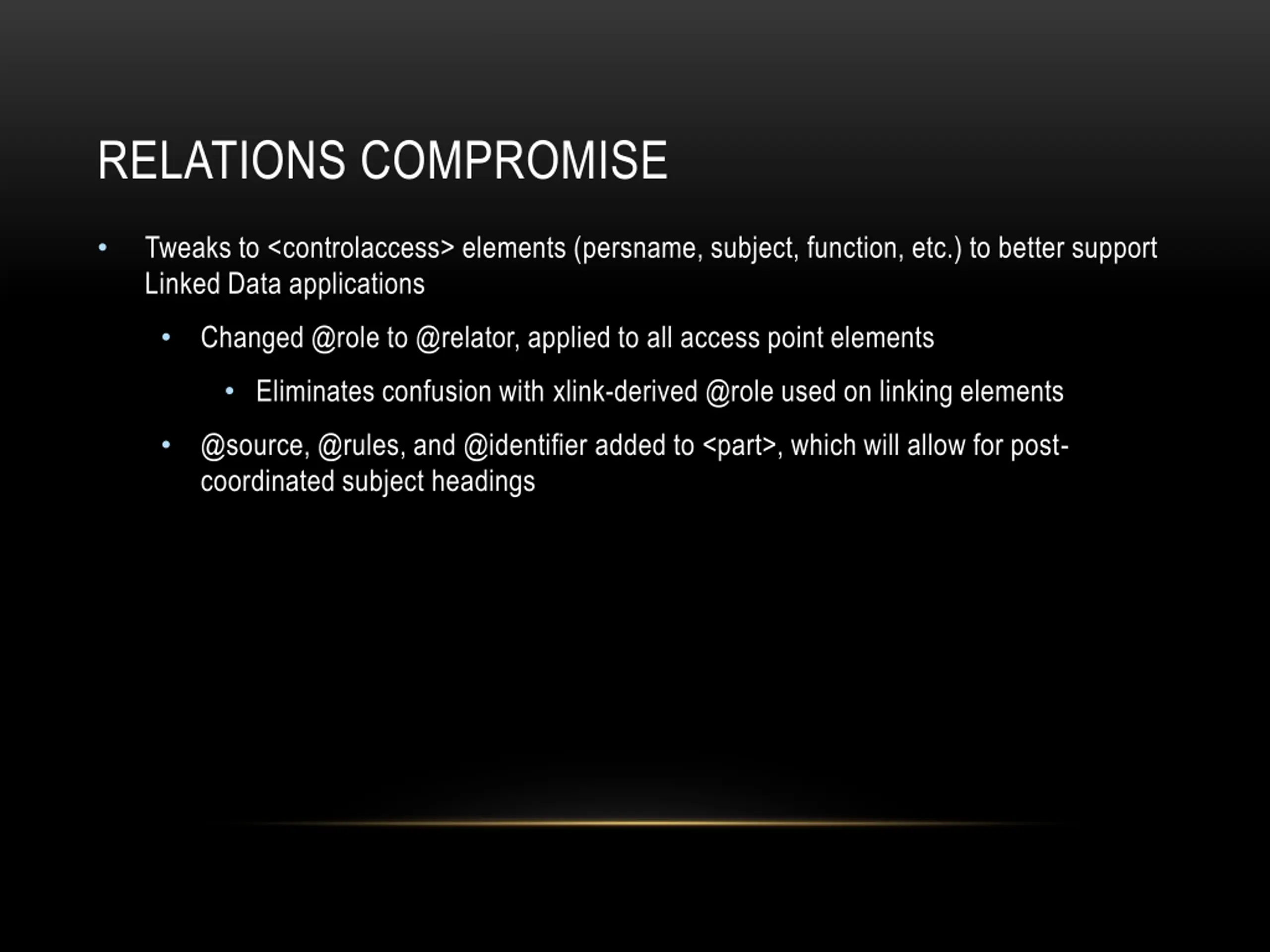 RELATIONS COMPROMISE Tweaks to <controlaccess> elements (persname, subject, function, etc.) to better support Linked Data applications Changed @role to @relator, applied to all access point elements Eliminates confusion with xlink-derived @role used on linking elements @source, @rules, and @identifier added to <part>, which will allow for post- coordinated subject headings