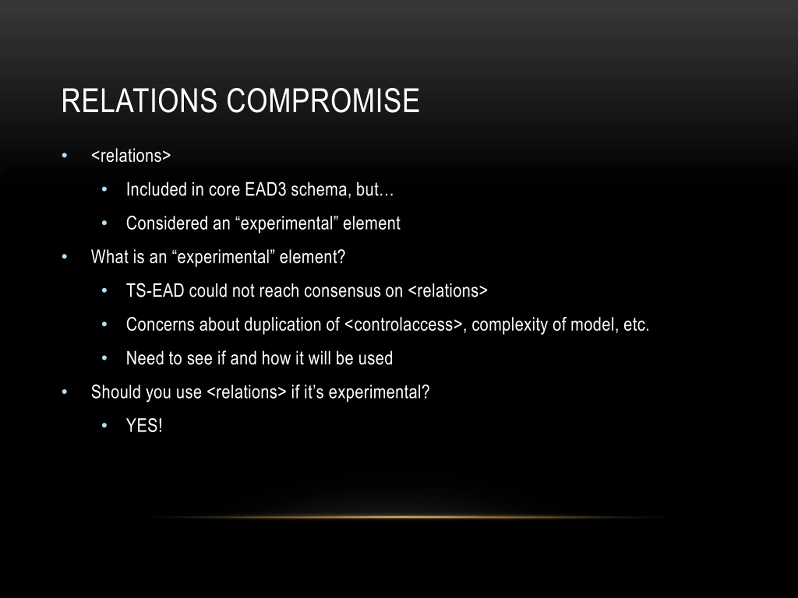 RELATIONS COMPROMISE <relations> Included in core EAD3 schema, but Considered an experimental element What is an experimental element? TS-EAD could not reach consensus on <relations> Concerns about duplication of <controlaccess>, complexity of model, etc. Need to see if and how it will be used Should you use <relations> if it s experimental? YES!