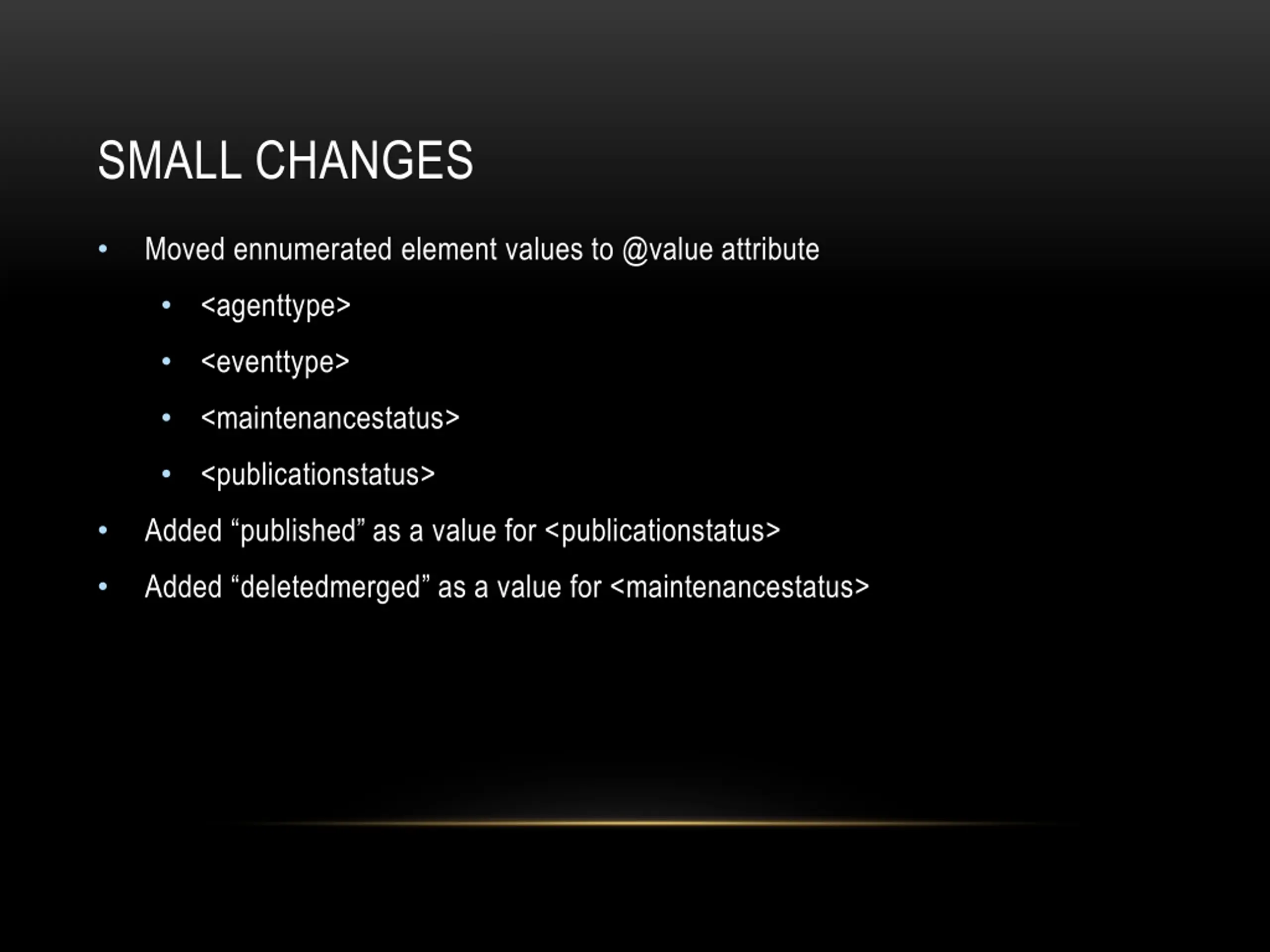 SMALL CHANGES Moved ennumerated element values to @value attribute <agenttype> <eventtype> <maintenancestatus> <publicationstatus> Added published as a value for <publicationstatus> Added deletedmerged as a value for <maintenancestatus>