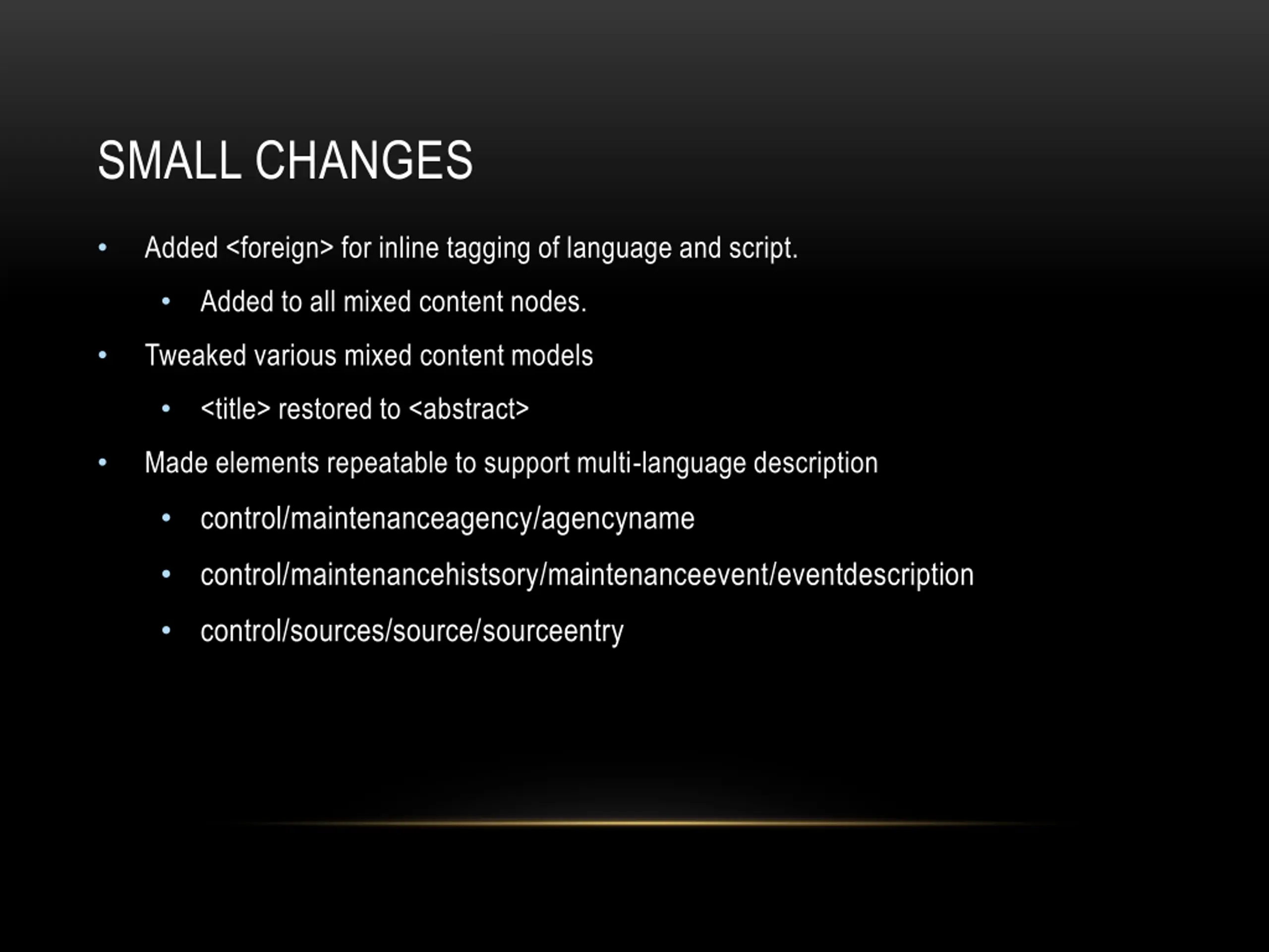 SMALL CHANGES Added <foreign> for inline tagging of language and script. Added to all mixed content nodes. Tweaked various mixed content models <title> restored to <abstract> Made elements repeatable to support multi-language description control/maintenanceagency/agencyname control/maintenancehistsory/maintenanceevent/eventdescription control/sources/source/sourceentry