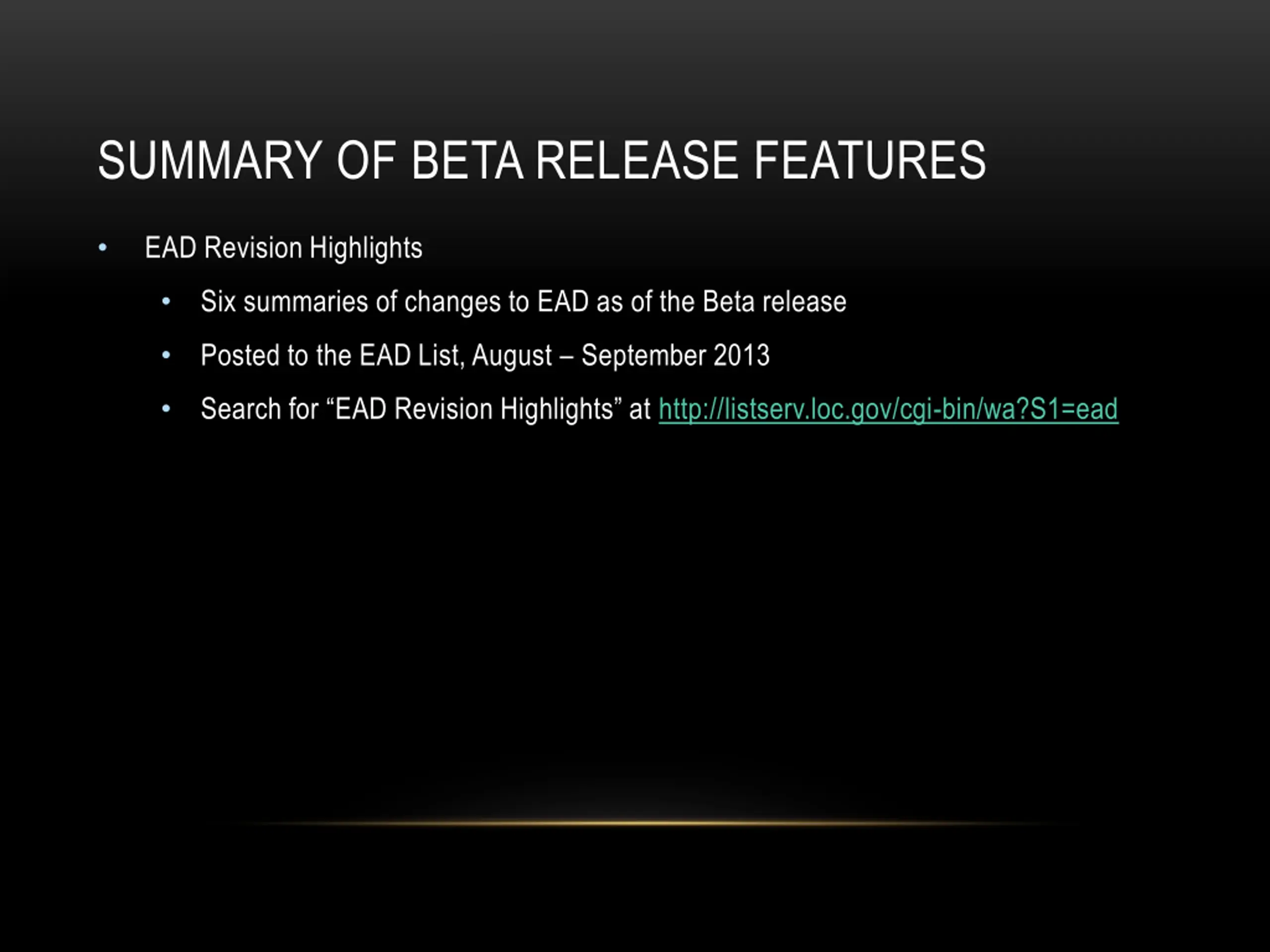 SUMMARY OF BETA RELEASE FEATURES EAD Revision Highlights Six summaries of changes to EAD as of the Beta release Posted to the EAD List, August September 2013 Search for EAD Revision Highlights at http://listserv.loc.gov/cgi-bin/wa?S1=ead