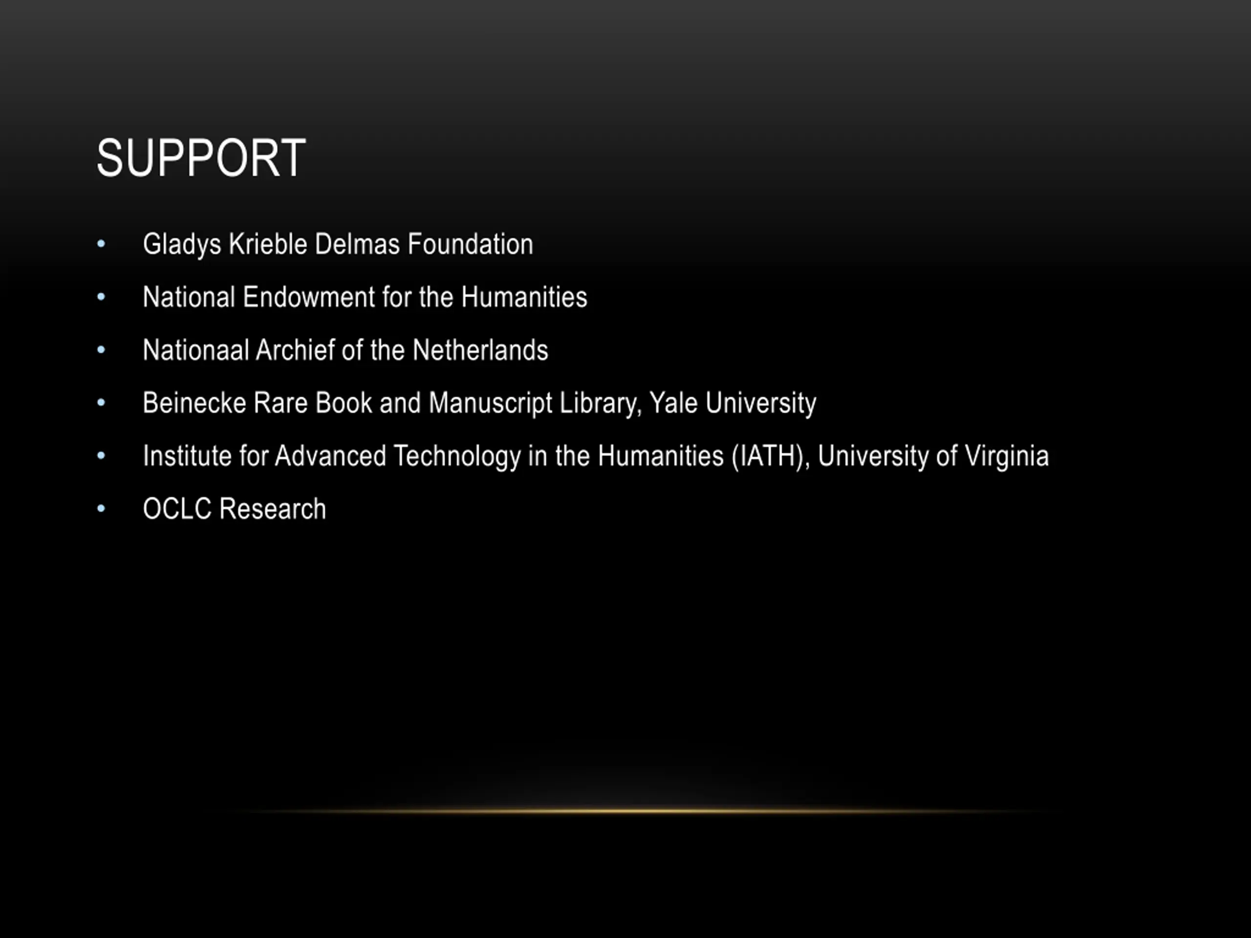 SUPPORT Gladys Krieble Delmas Foundation National Endowment for the Humanities Nationaal Archief of the Netherlands Beinecke Rare Book and Manuscript Library, Yale University Institute for Advanced Technology in the Humanities (IATH), University of Virginia OCLC Research